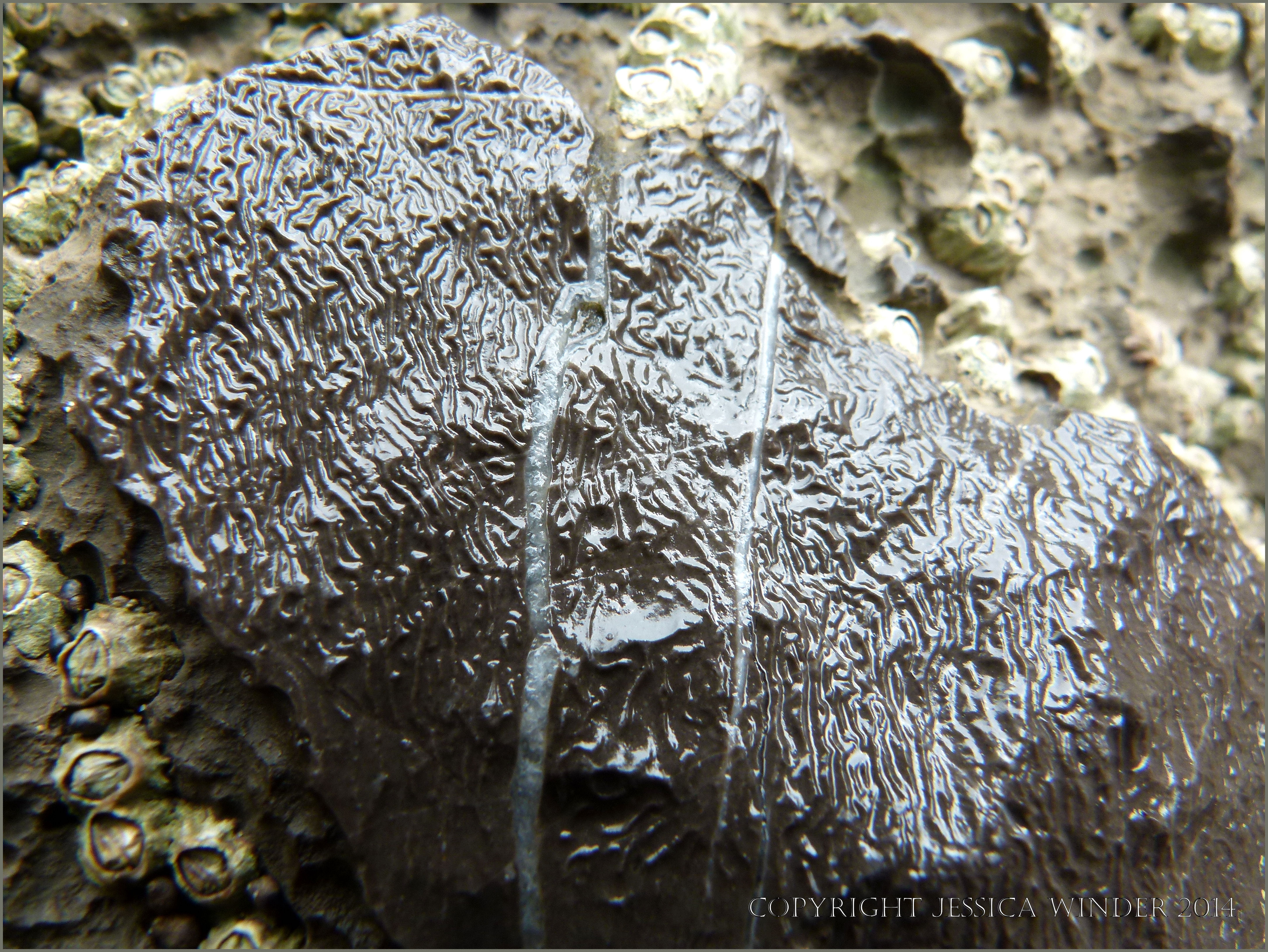 Tenby Rock Textures 25 – Darker patches on the surface of eroded limestone are covered in fine grooves and ridges barely visible to the naked eye. These could be caused by acid rain rather like the microrills or miniature rillen karren which occur in karst topography. Photographed in Hunts Bay Oolite of the Carboniferous Period at South Beach in Tenby, South Wales.