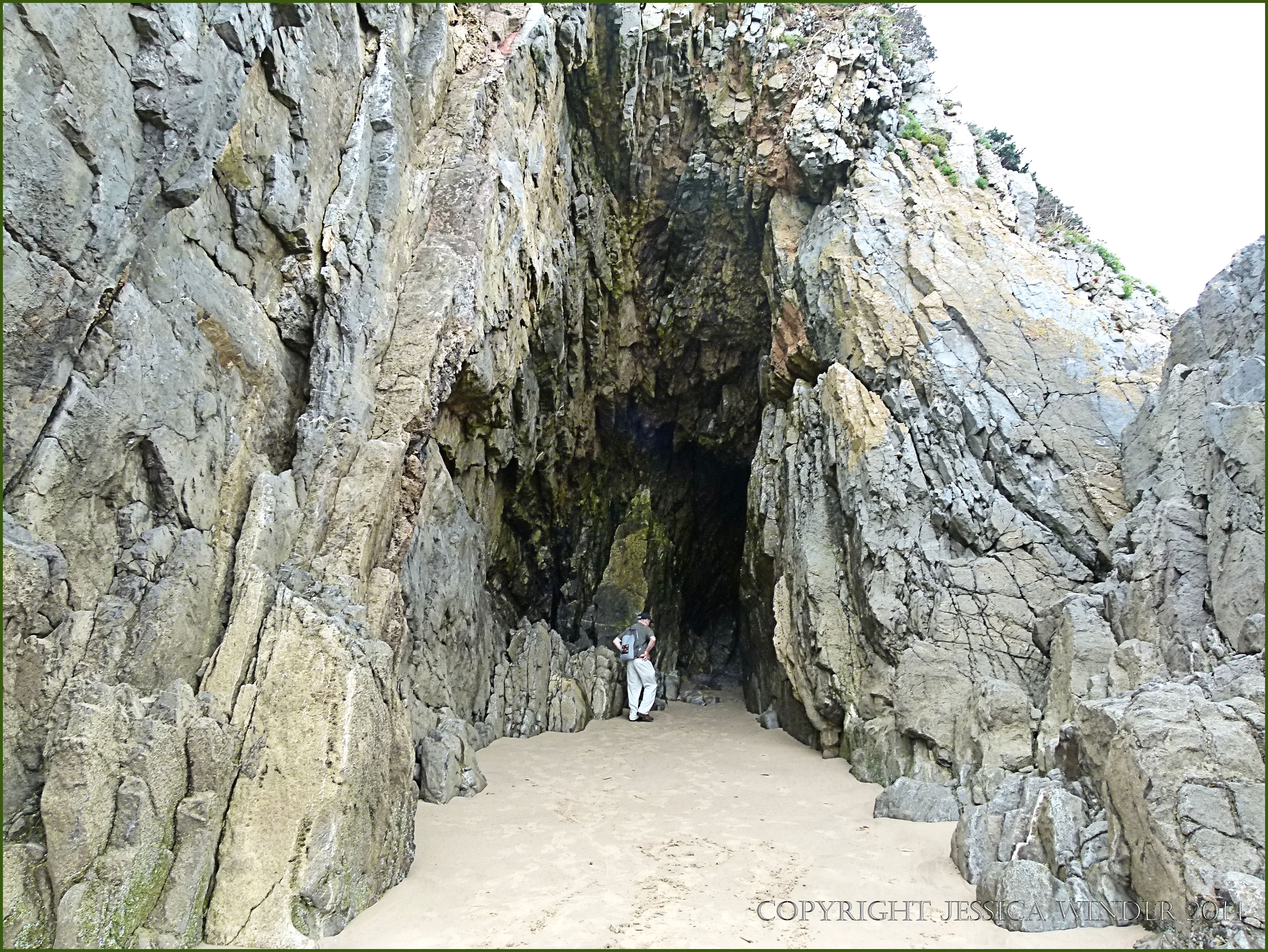 Tenby Rock Textures 36 – Entrance to a larger cave on South Beach in Tenby, eroded between the near-vertical strata of Carboniferous Hunts Bay Oolite.