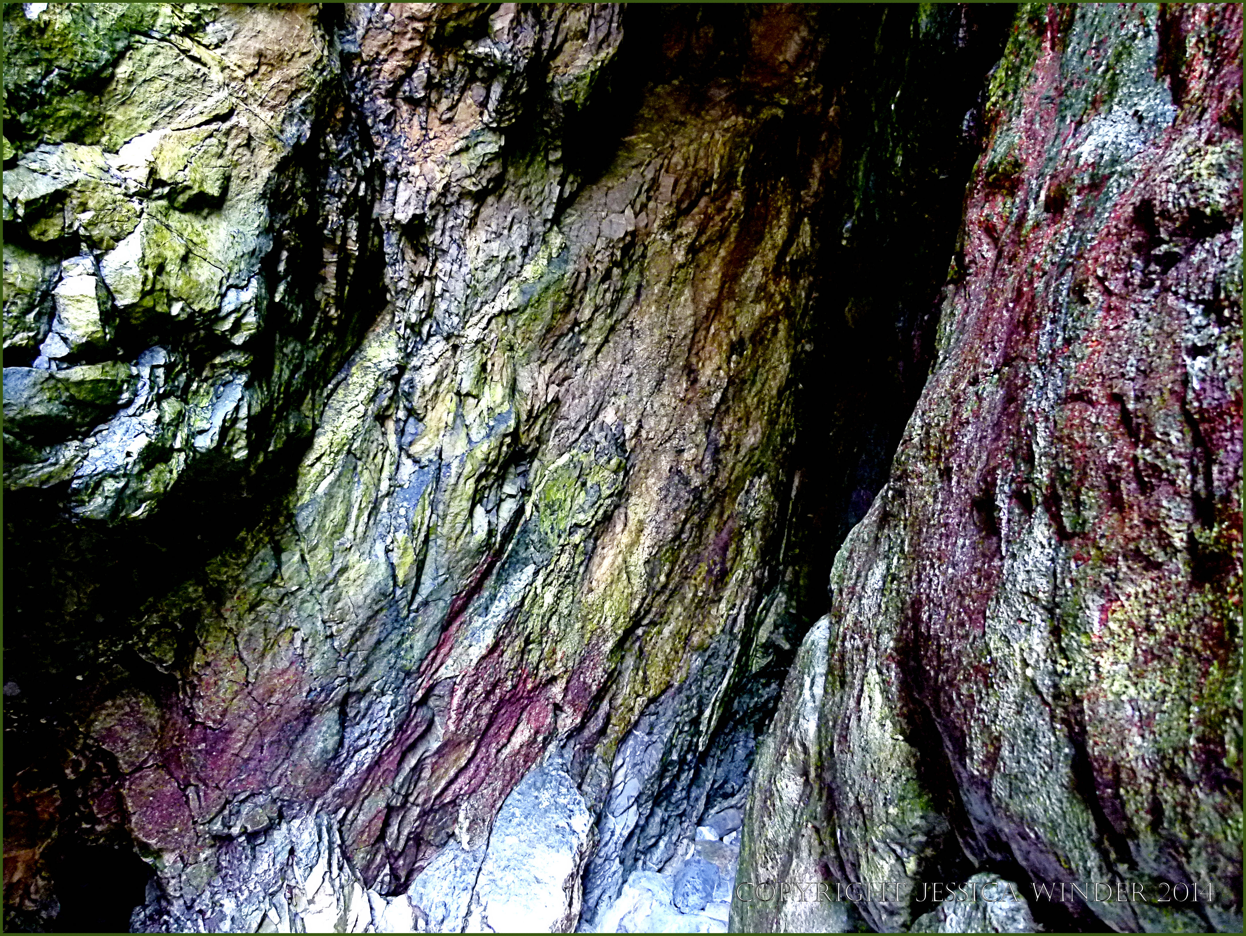 Tenby Rock Textures 37 – Cave walls with red and green mosaic pattern in Tenby, South Wales, thought to be cyanobacterial biofilm rather than algal encrustations.