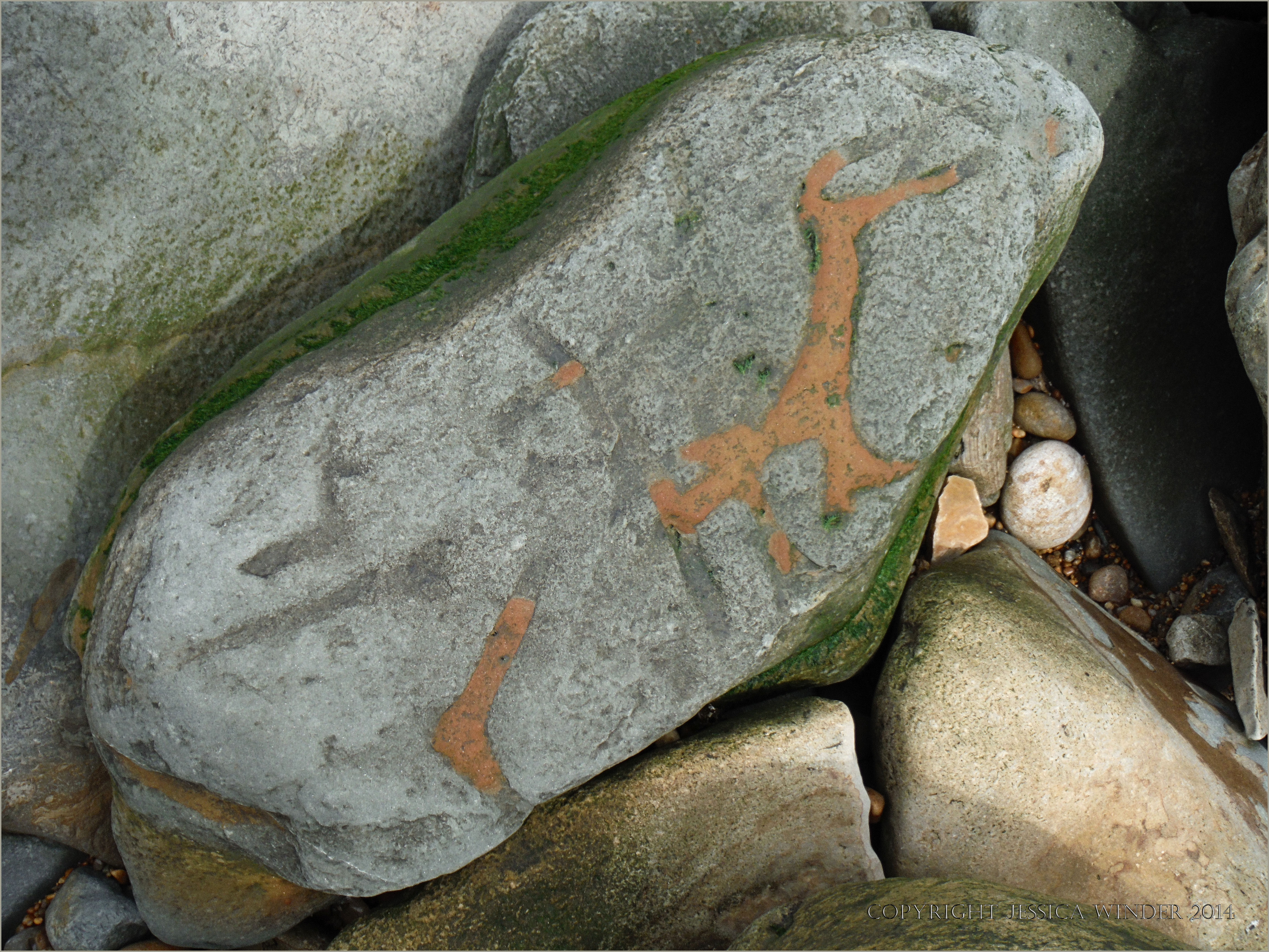 Beach Boulders at Eype 24 – Detail of orange sediment fill in trace fossil burrows in a small boulder shown in Image 23, at the top of the shore at Eype in Dorset, England.