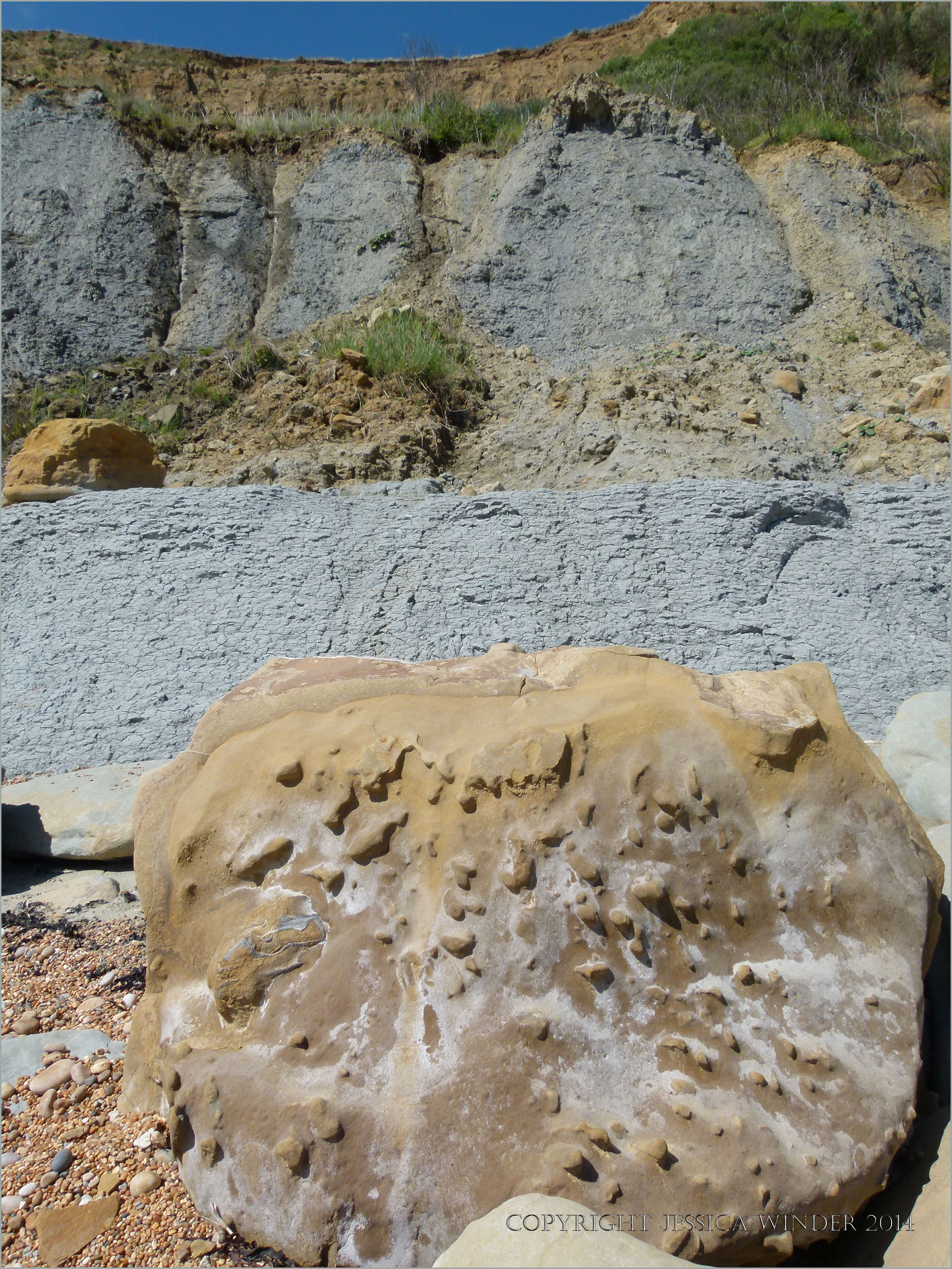 Beach Boulders at Eype 36 – Sedimentary rock boulder (from the Middle Lias in the Jurassic Period) on the seashore showing nodules. Photographed at Eype in Dorset, England.