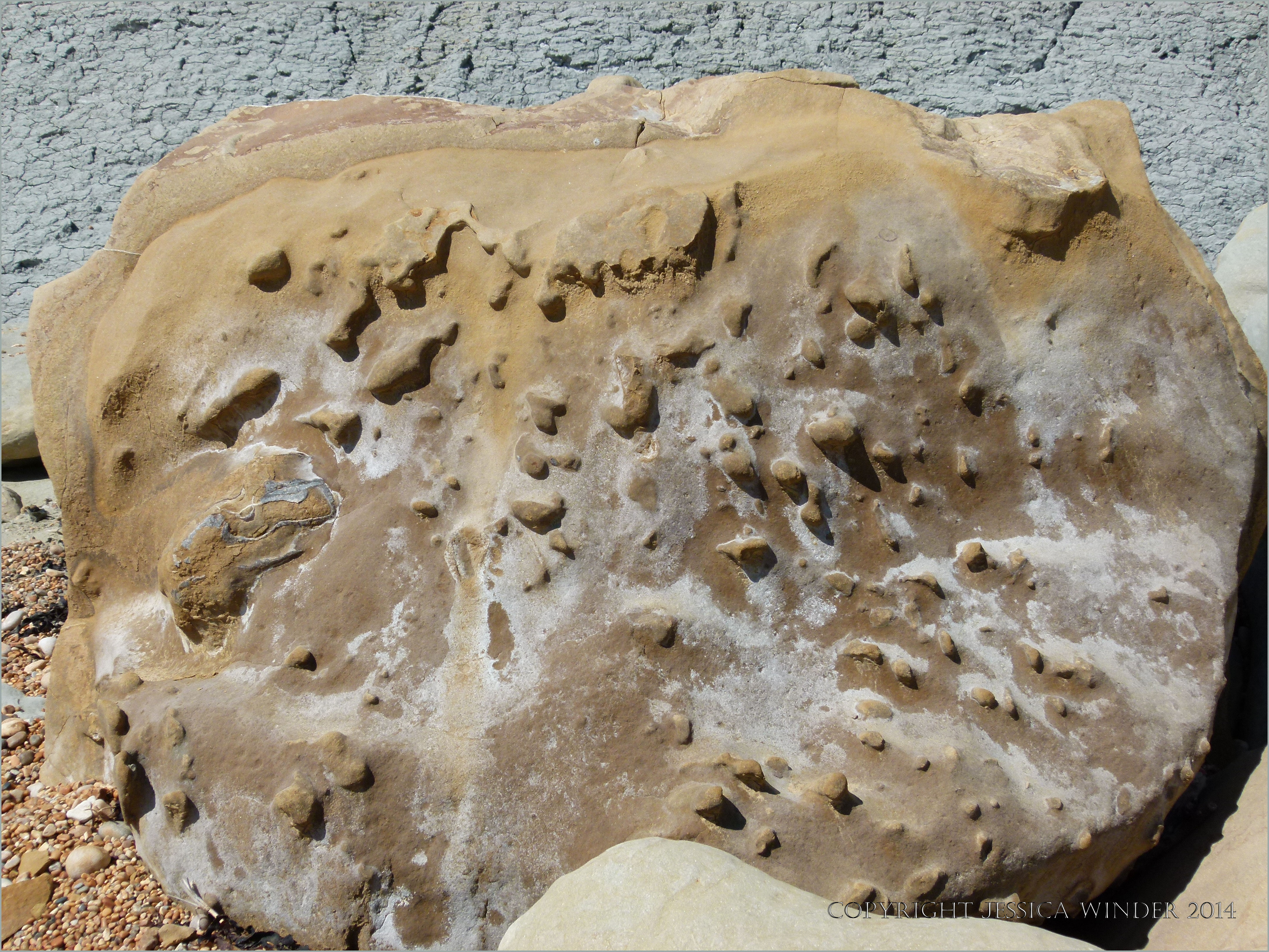 Beach Boulders at Eype 37 – Close-up of sedimentary rock boulder (from the Middle Lias in the Jurassic Period) on the seashore showing nodules. Photographed at Eype in Dorset, England.
