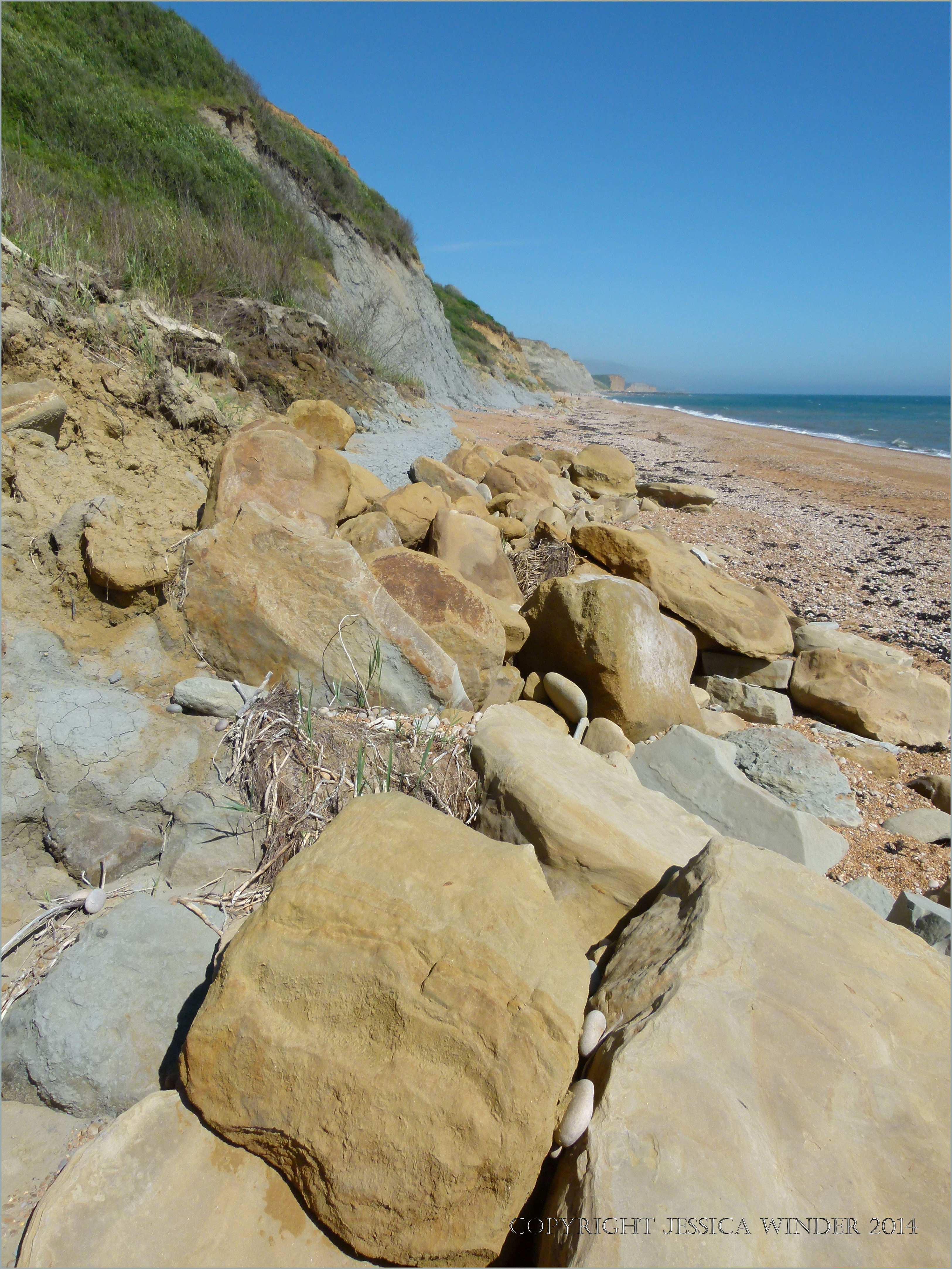 Beach Boulders at Eype 46 – Sedimentary rock beach boulders at the base of clay cliffs of the Middle Lias in the Jurassic Period. Photographed at Eype in Dorset, England.