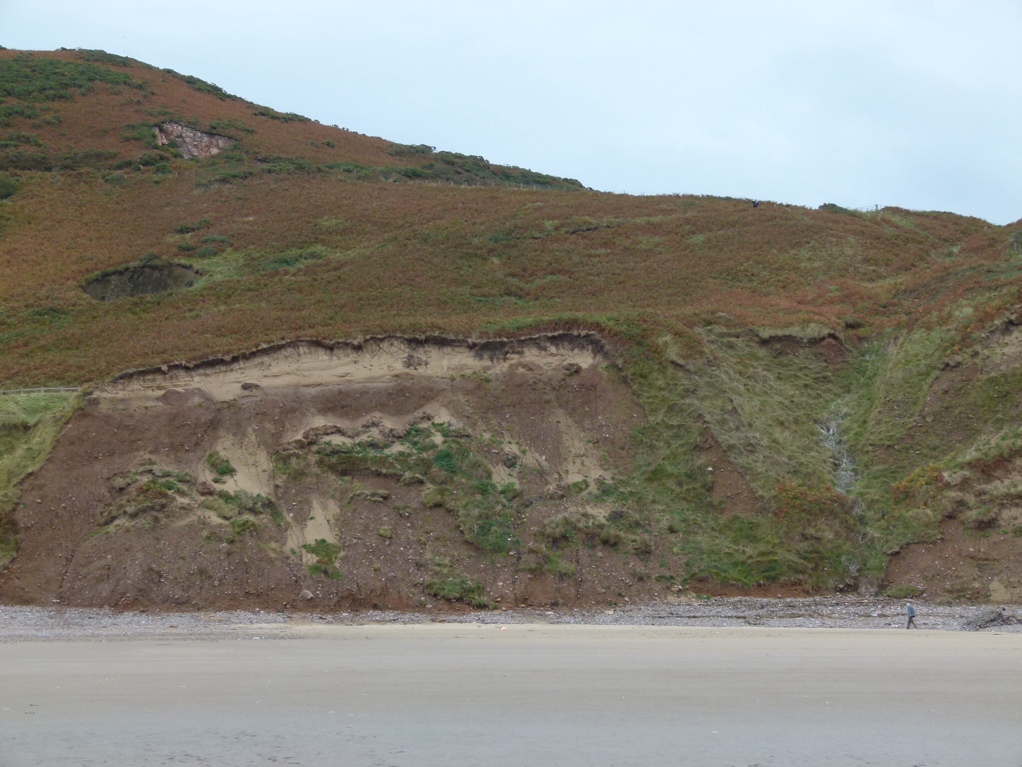 Rhossili Cliff Walk 5 – View of red soil in the land slip area of last winter at Rhossili Beach, between Rhossili Down and solifluction terrace and the Rhossili headland on which the village sits, Gower Peninsula, South Wales, 14 October 2014.