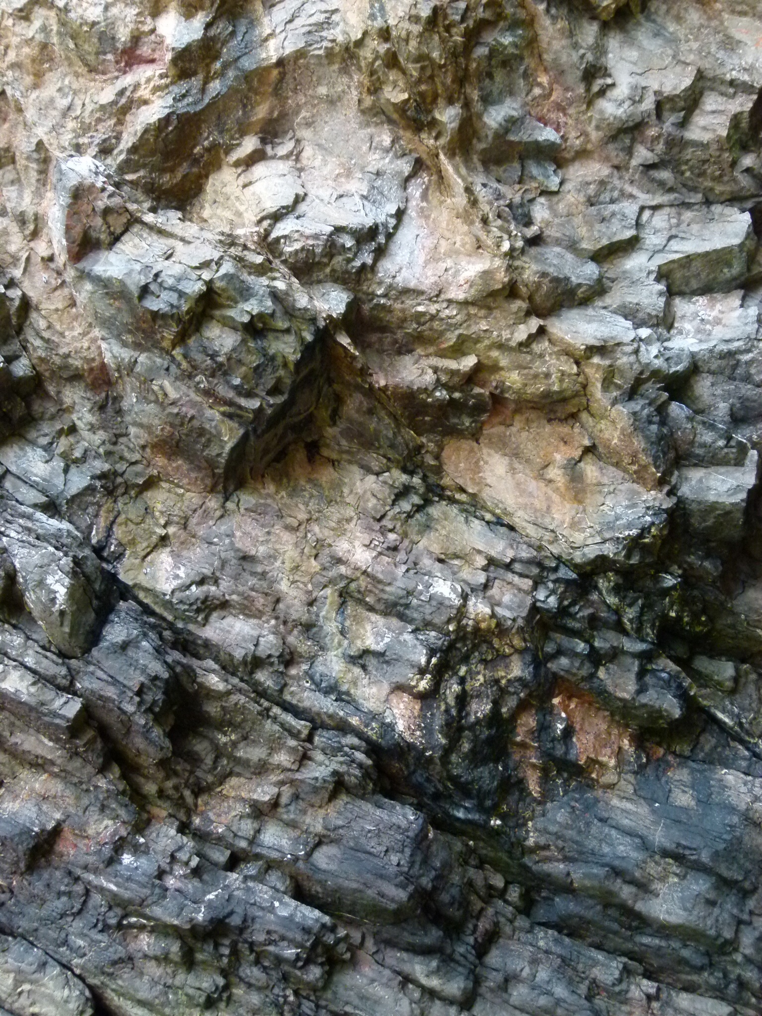 Rhossili Cliff Walk 28 – Limestone cliff strata showing bright orange and buff coloured surfaces where rocks have recently fallen. Rhossili on the Gower Peninsula in South Wales, 14 October 2014.