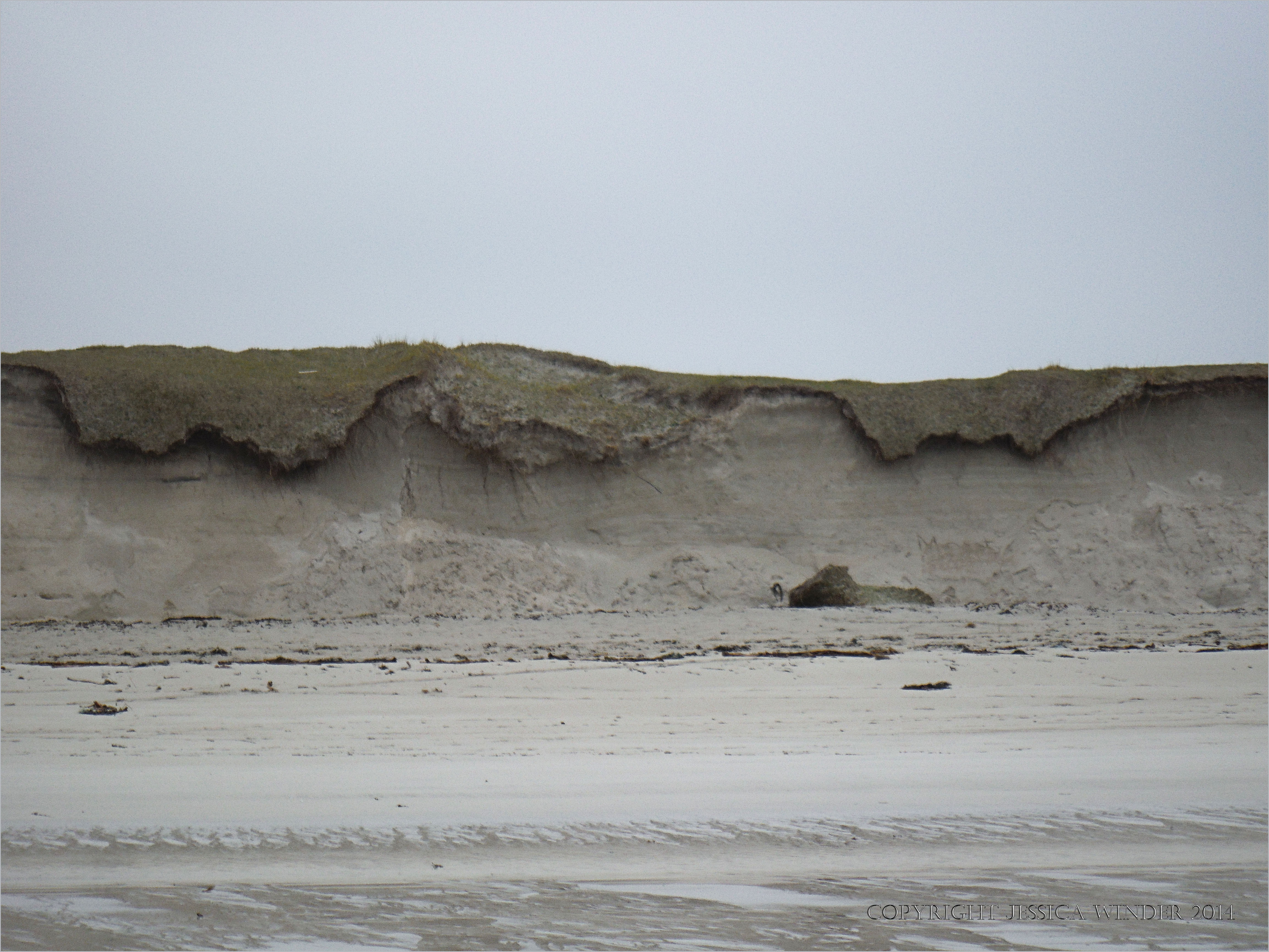 Tombolo at Dogs Bay 6 – Erosion of the west facing calcareous sand dunes on the Dogs Bay/Gorteen Bay tombolo (spit) in Connemara on the west coast of Ireland, showing dunes at the landward (north) end of the beach, and mats of turf overhanging where sand has been removed by waves from the dune face, 31st march 2014.