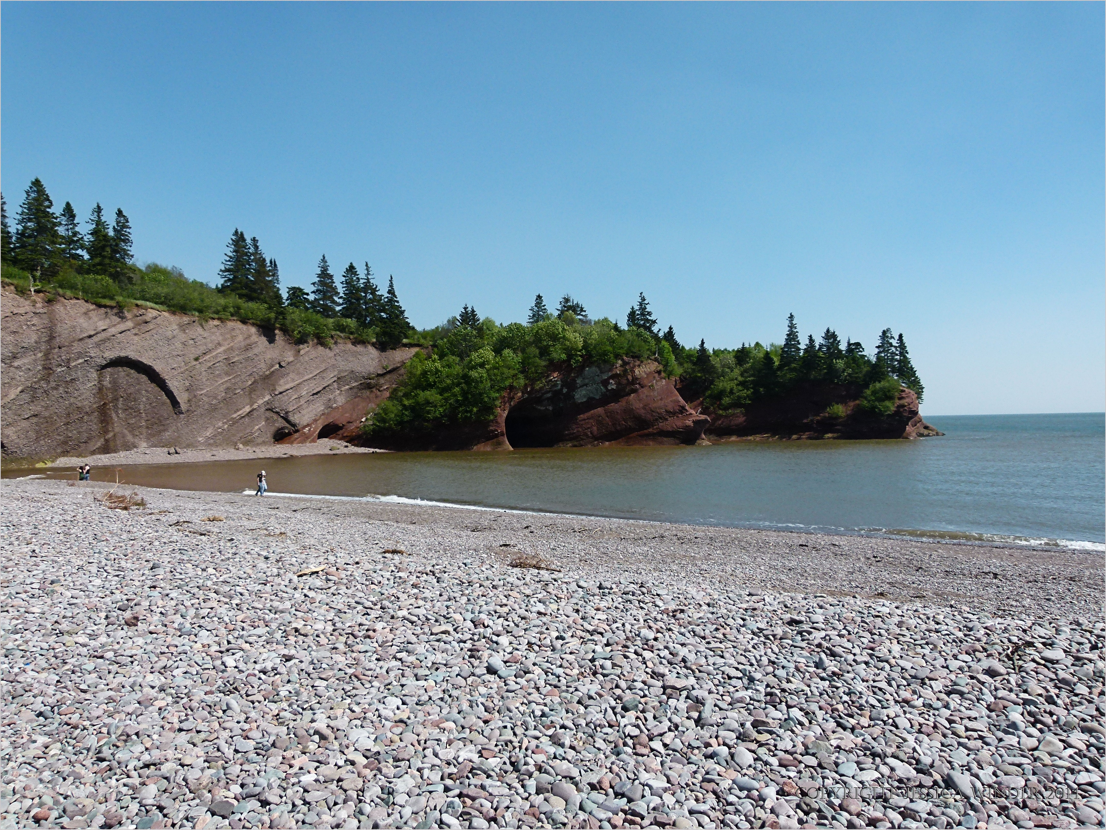 St Martins Rocks 2 – View across the beach to Triassic Period rocks in cliffs with sea caves at St Martins, New Brunswick, on the coast of the Bay of Fundy in Canada.
