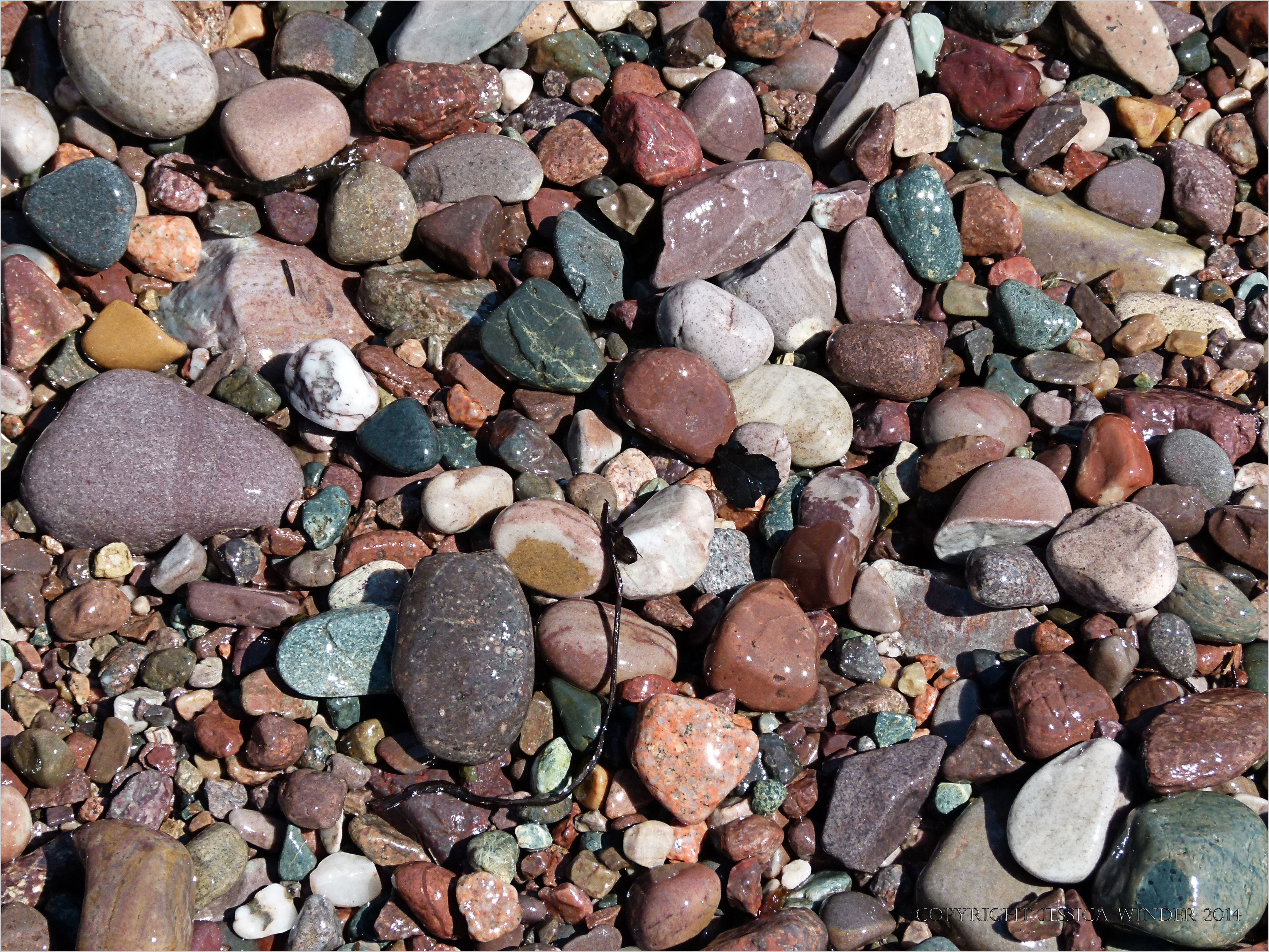 St Martins Rocks 15 – Wet pebbles of different colours and patterns on the beach at St Martins in New Brunswick, on the coast of the Bay of Fundy in Canada, mostly derived from the Triassic Period rocks in the nearby cliffs (especially the conglomerate of the Quaco Formation conglomerate), and also from overlying glacial deposits.