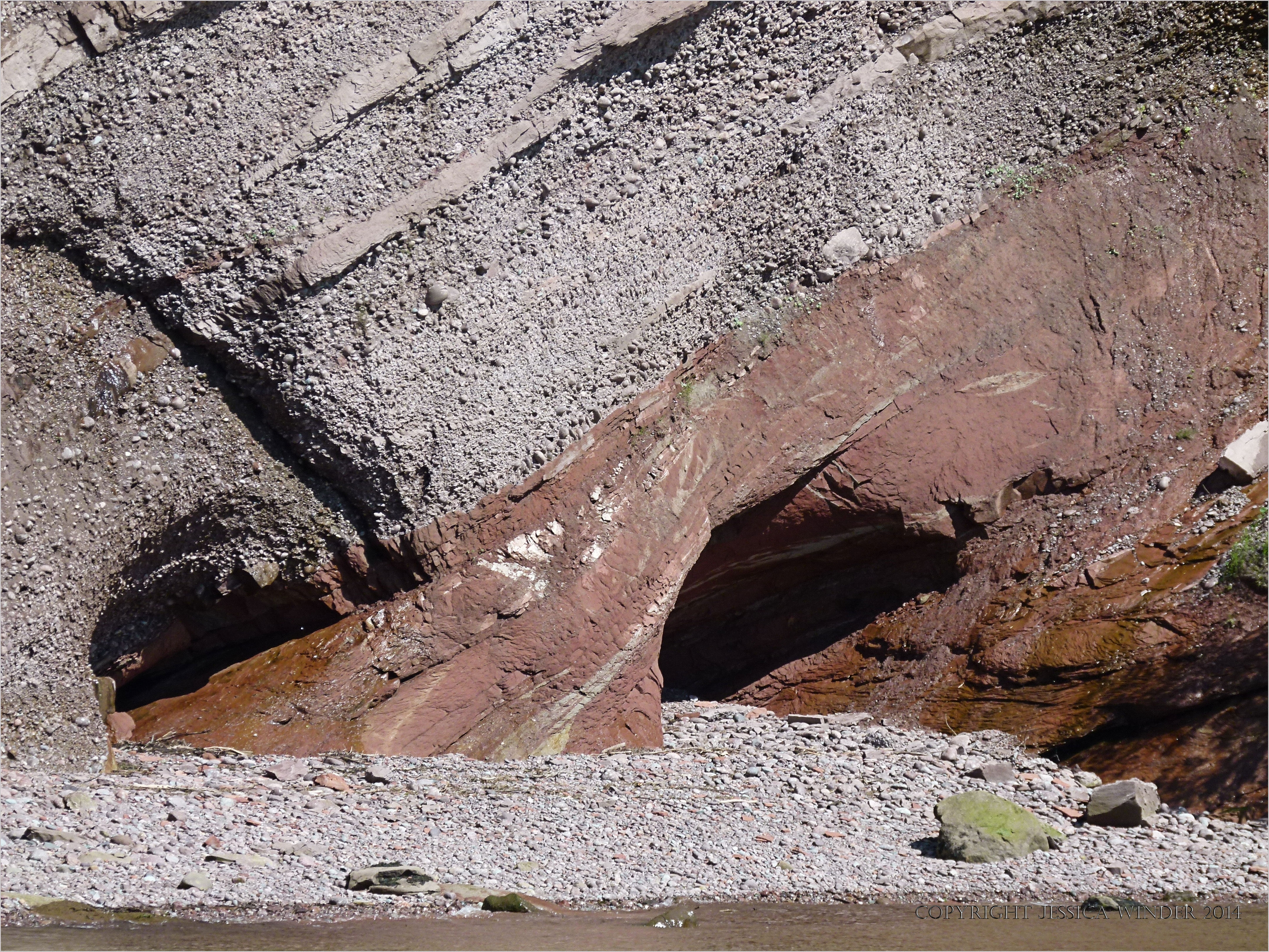 St Martins Rocks 7 – View across the beach to Triassic Period rocks in cliffs with sea caves at St Martins, New Brunswick, on the coast of the Bay of Fundy in Canada, showing the junction between the Quaco Formation conglomerate on the left and the Honeycomb Point Formation red sandstones on the right.