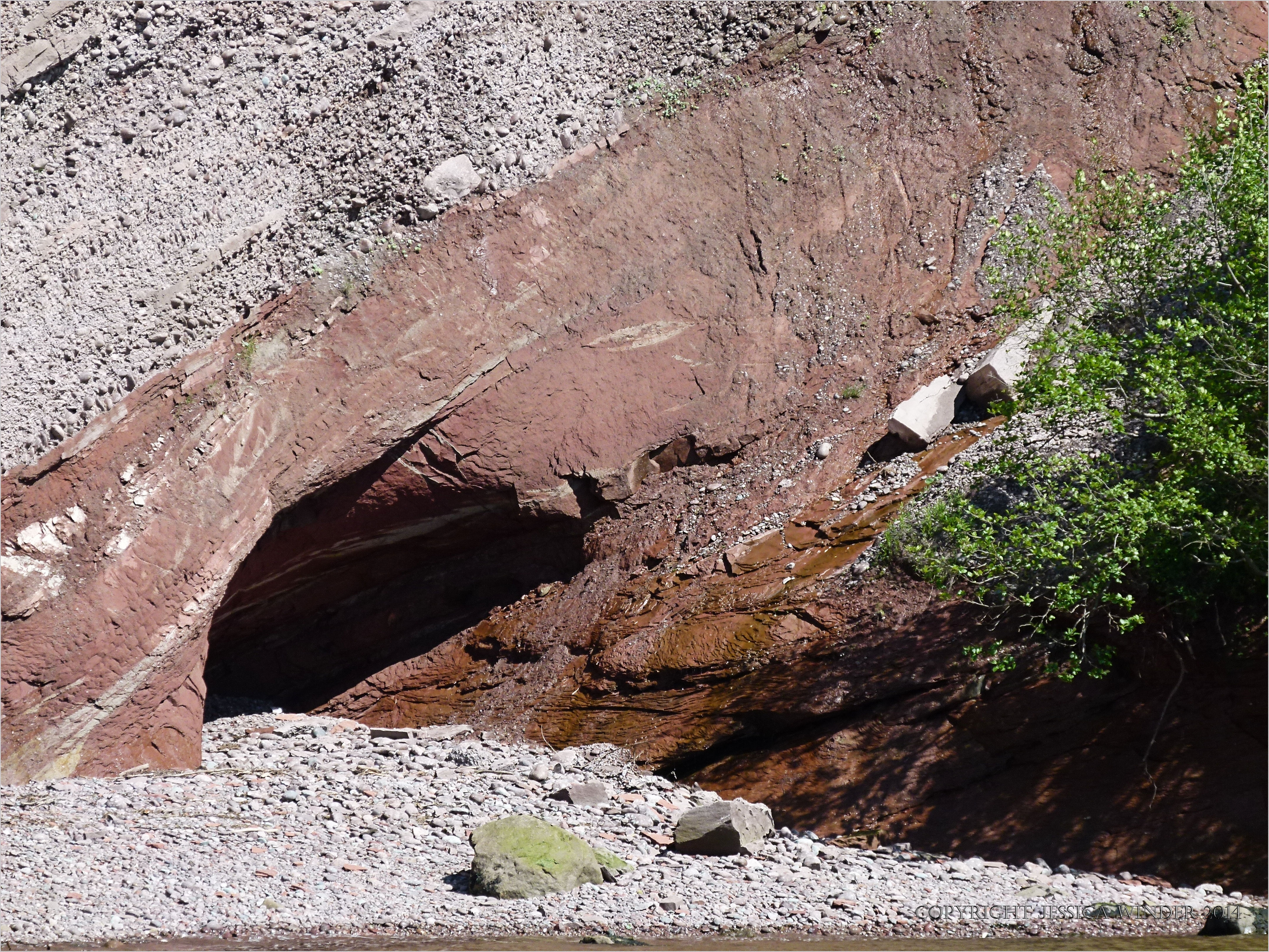 St Martins Rocks 6 – View across the beach to Triassic Period rocks in cliffs with sea caves at St Martins, New Brunswick, on the coast of the Bay of Fundy in Canada, showing the junction between the Quaco Formation conglomerate on the left and the Honeycomb Point Formation red sandstones on the right.