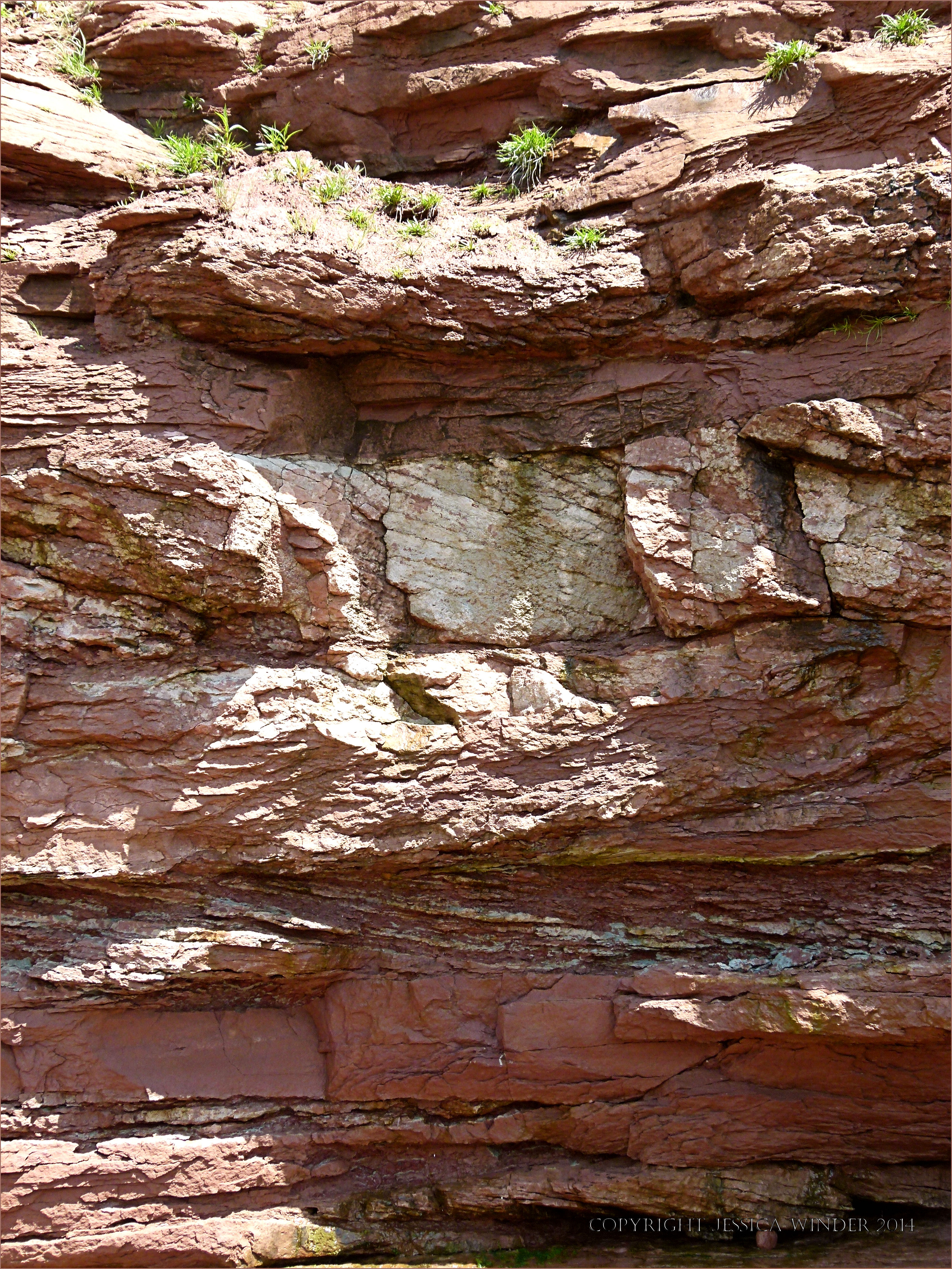 Waterside Rocks 10 – Vertical cross-section through red Triassic rock strata in the cliff at Waterside, New Brunswick, Canada, on the Bay of Fundy, showing cross-bedding.
