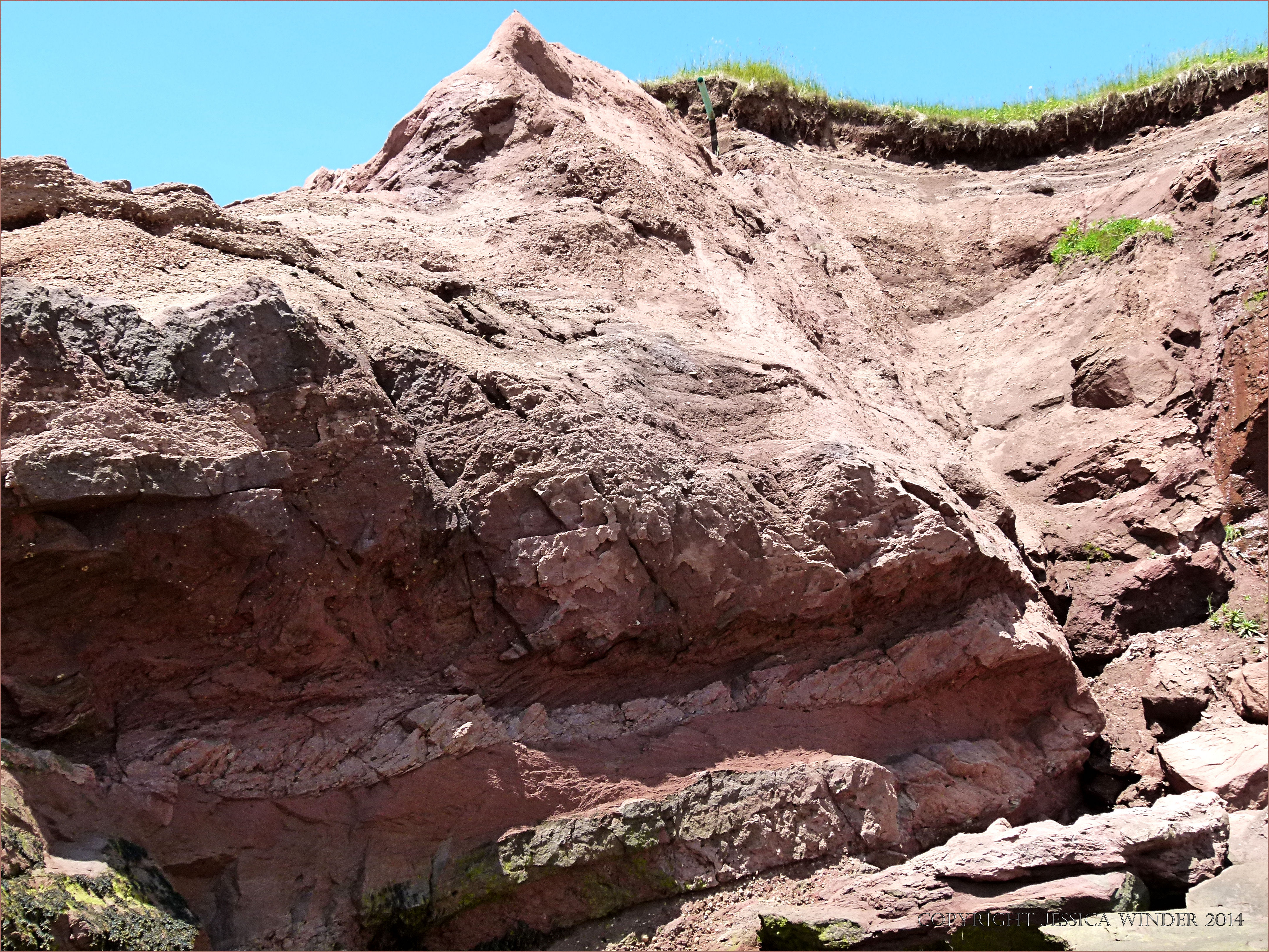 Waterside Rocks 21 – Cliff face of Triassic sediments at Waterside in New Brunswick, canada, on the Bay of Fundy, showing distinct pale layer of more calcareous deposits.