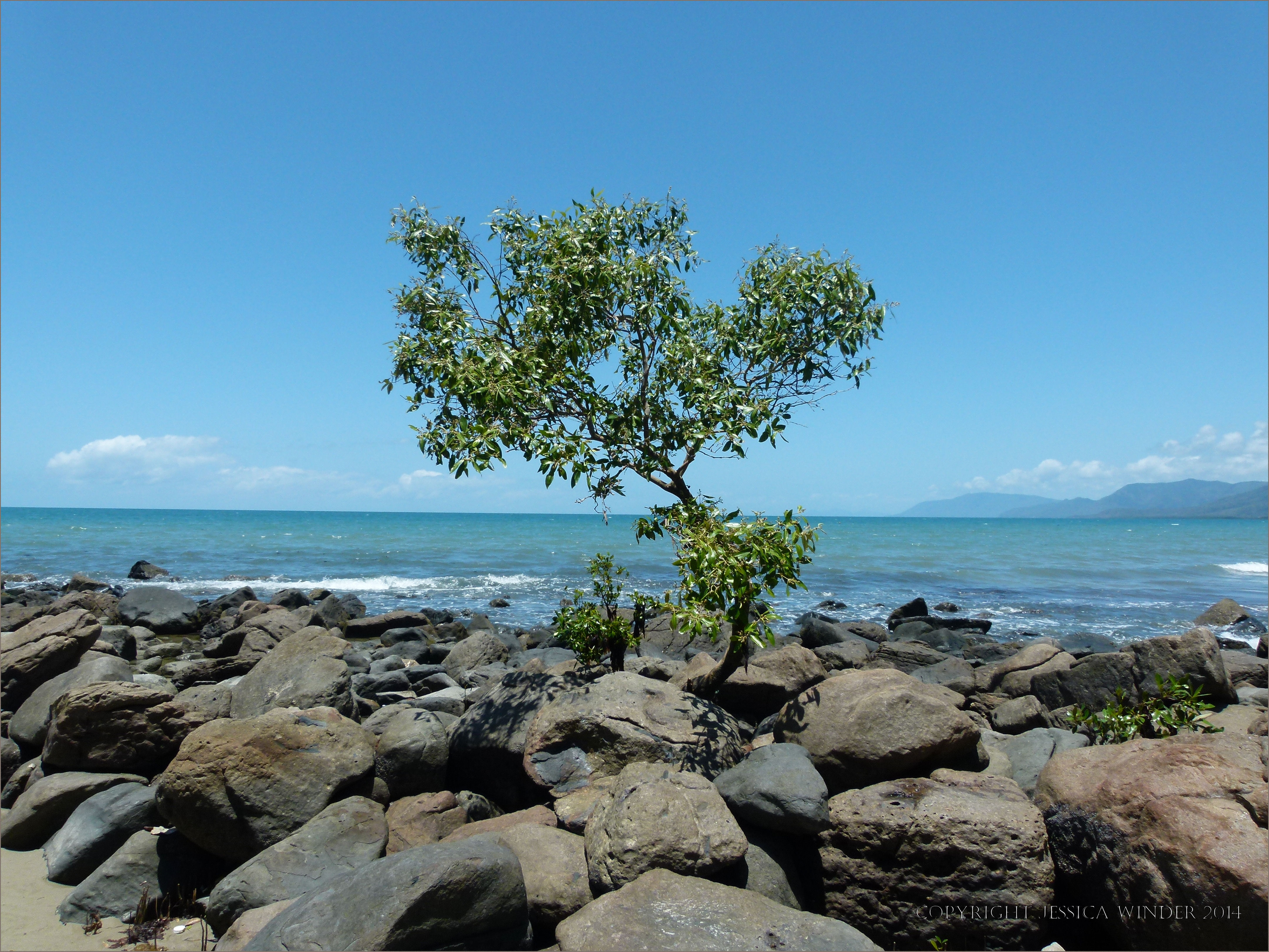 Port Douglas Rocks 1 – Mangrove tree growing on waterside boulders at Four Mile Beach in Port Douglas, Queensland, Australia.