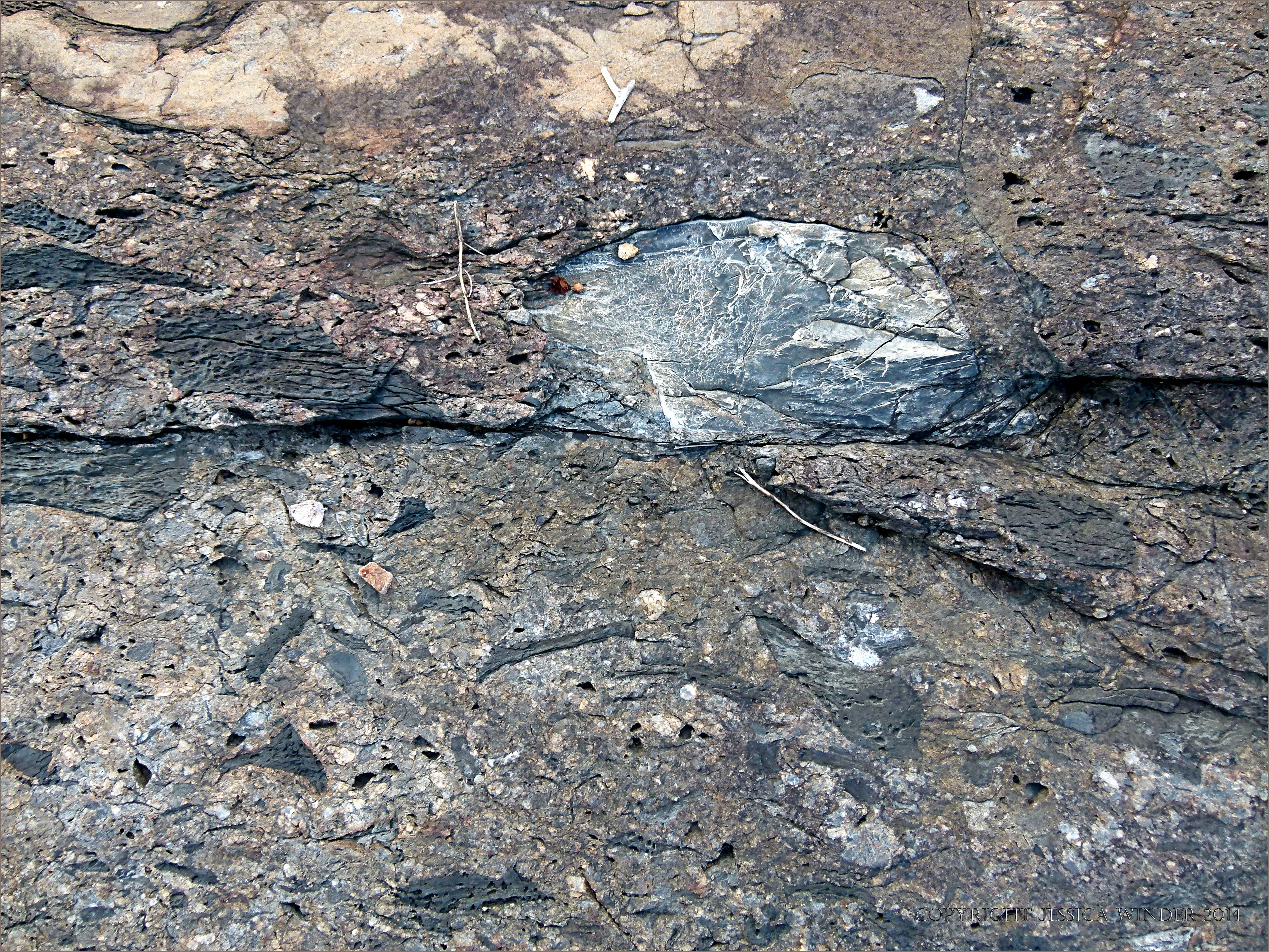 Port Douglas Rocks 37 – Colour and texture, possibly showing evidence of extrusive volcanic activity, in a rock outcrop near Four Mile Beach in Port Douglas, Queensland, Australia. I wonder if this is agglomerate, which is a type of composite rock made up of fragments larger than 20 mm, thrown out by a volcano during explosive eruptions.