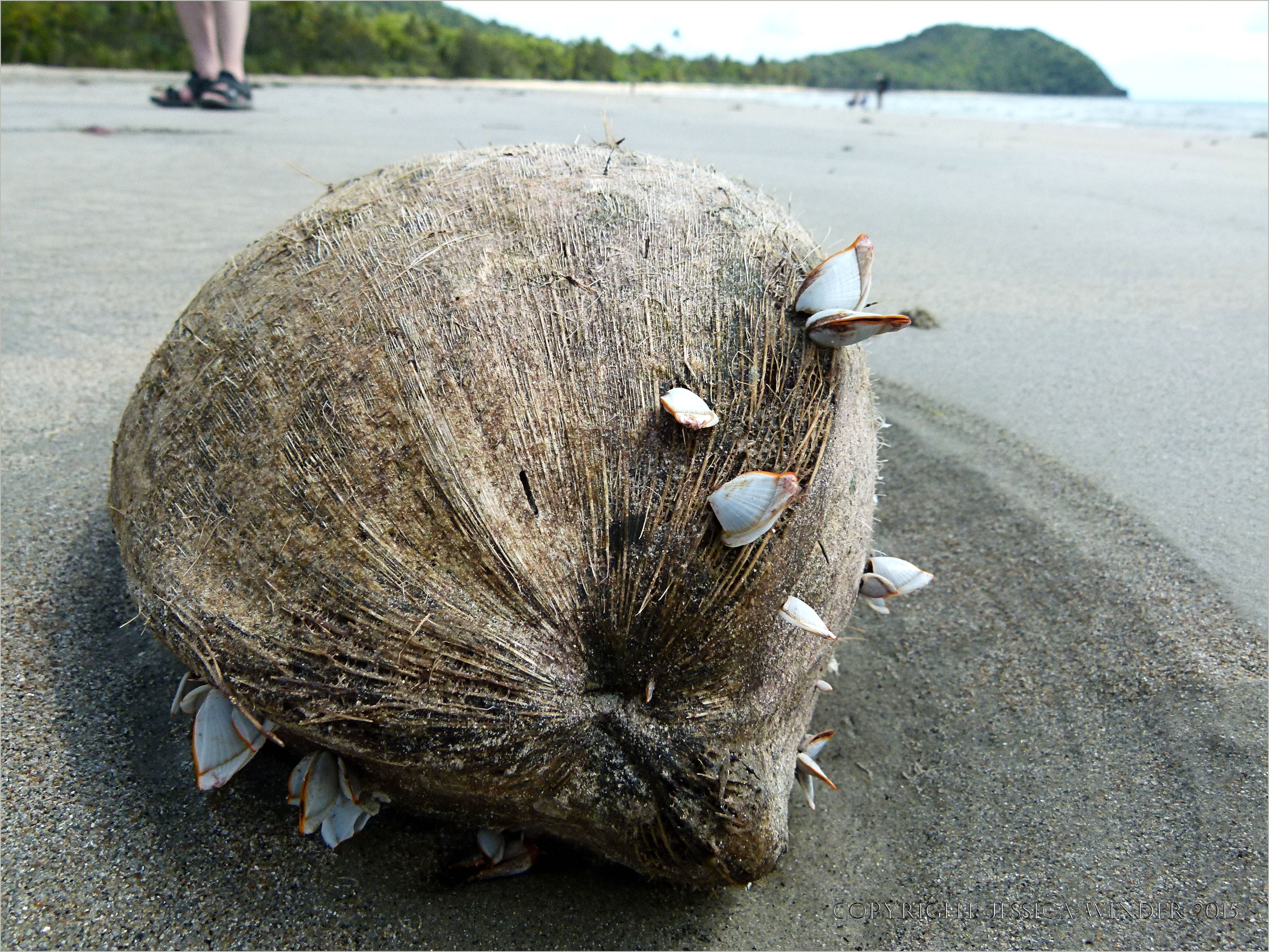 Coconuts 10 – Flotsam coconut (Cocos nucifera) with attached goose barnacles on the beach at Cape Tribulation, Queensland, Australia.