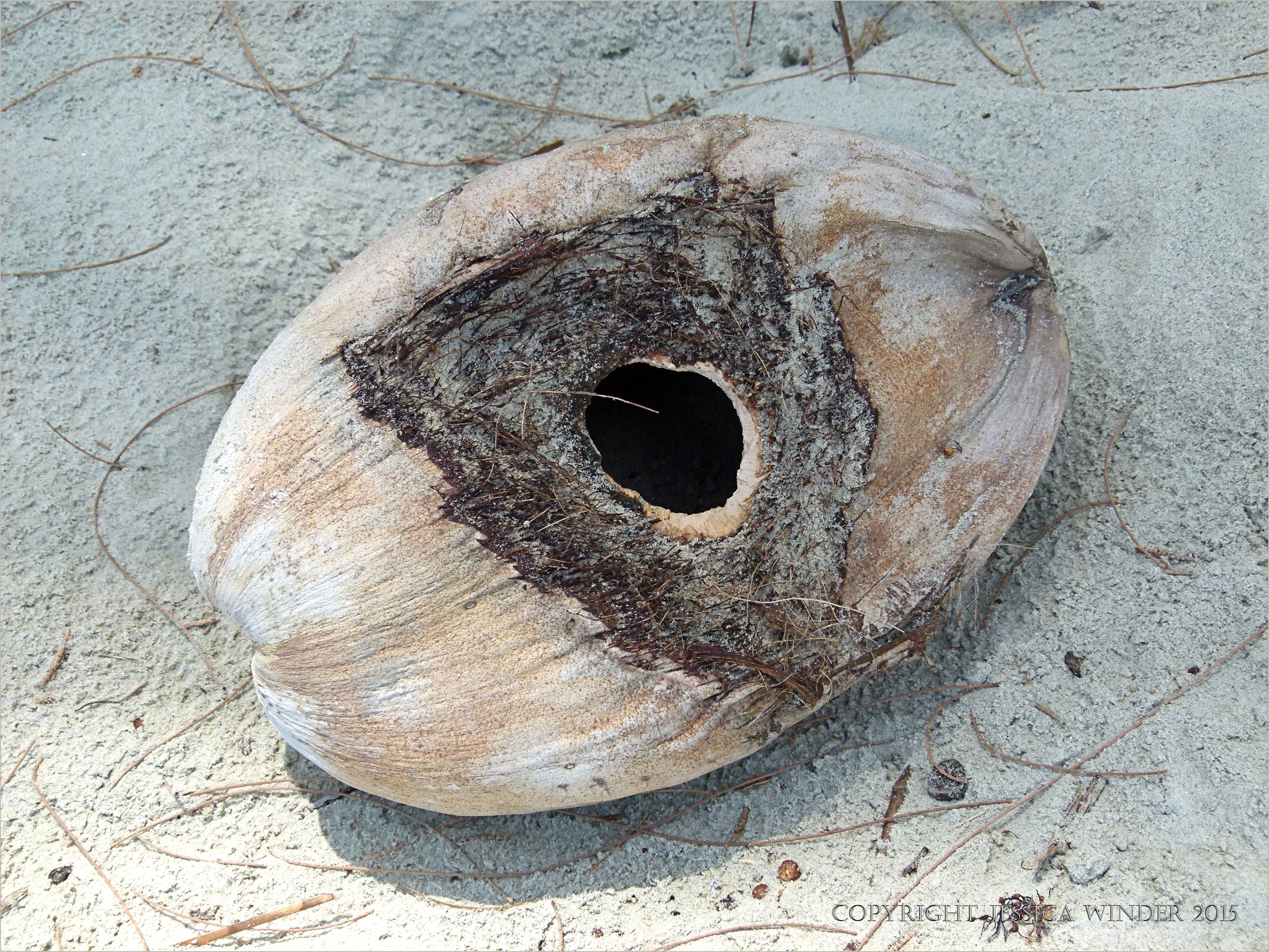 Coconuts 14 – Empty coconut (Cocos nucifera) with hole made by the White-tailed Rat (Uromys caudimaculatus) at Cape Tribulation, Queensland, Australia.
