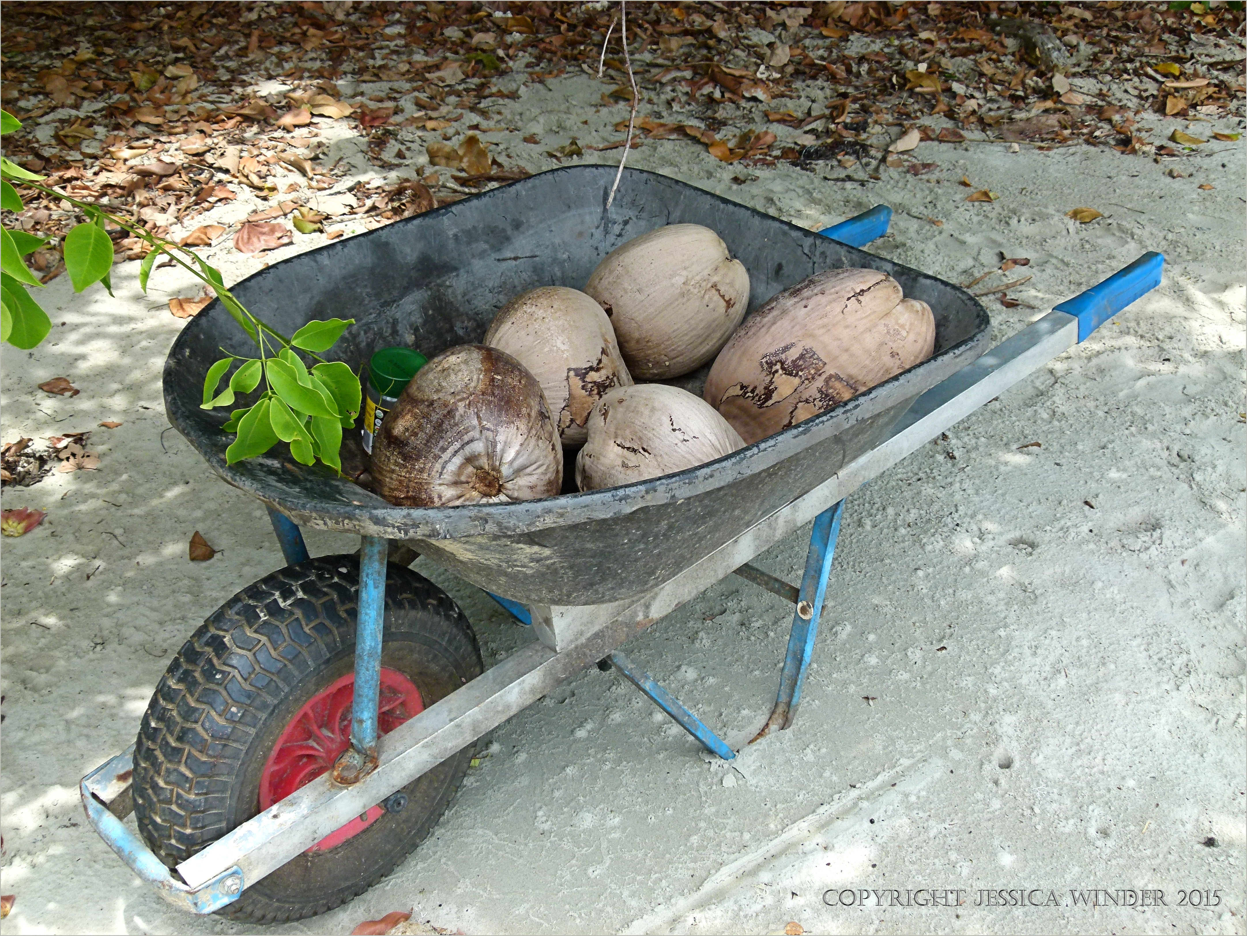 Coconuts 16 – Wheel barrow of coconuts (Cocos nucifera) in the shade at the top of the shore at Cape Tribulation, ready for beach-side cocktails in a bistro hidden among the palms, Queensland, Australia.