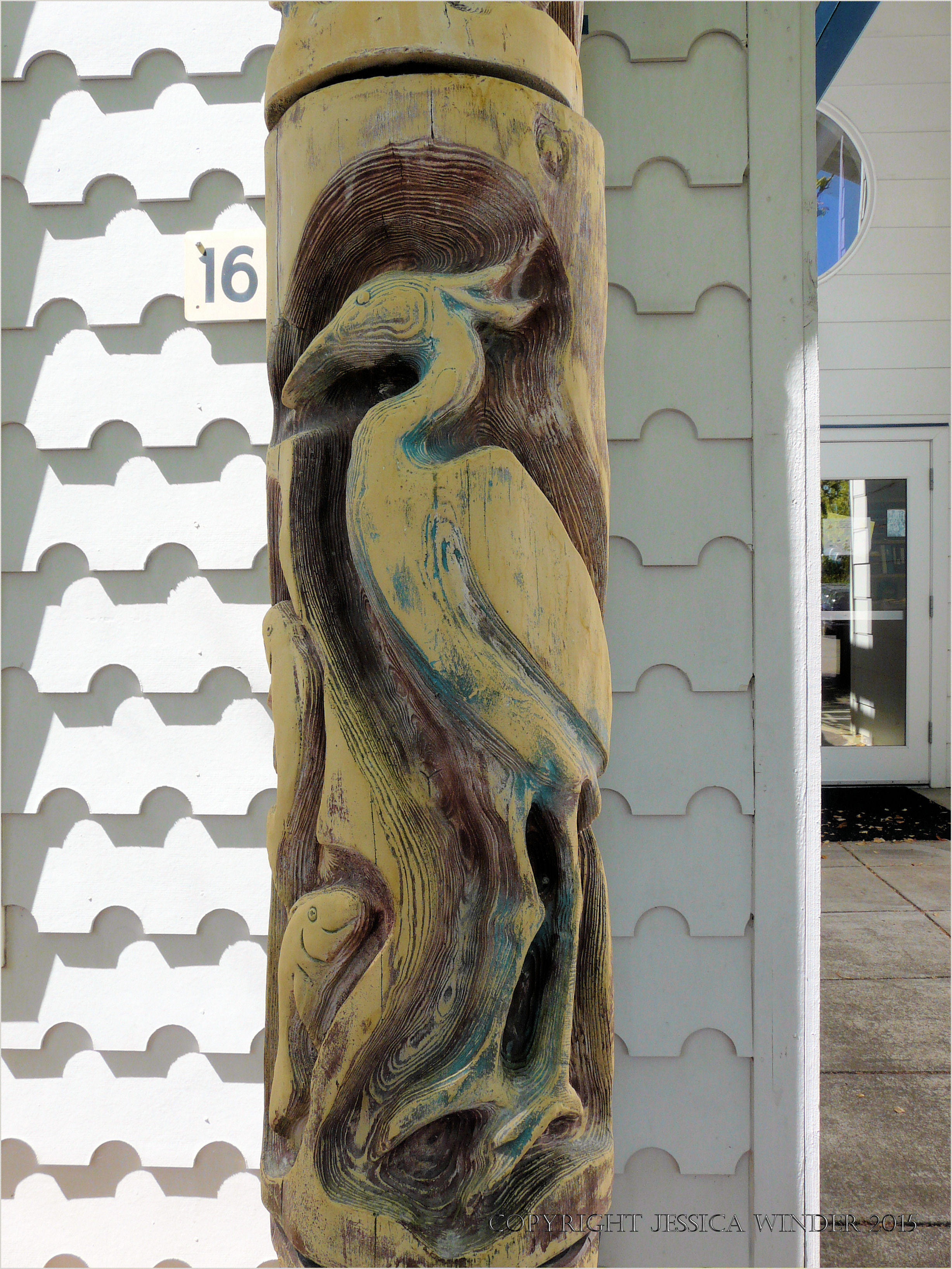 Oregon Animal Art 10 Oregon Animal Art 10 – Wood carving of water bird on house on the campus of the University in Eugene, Oregon.