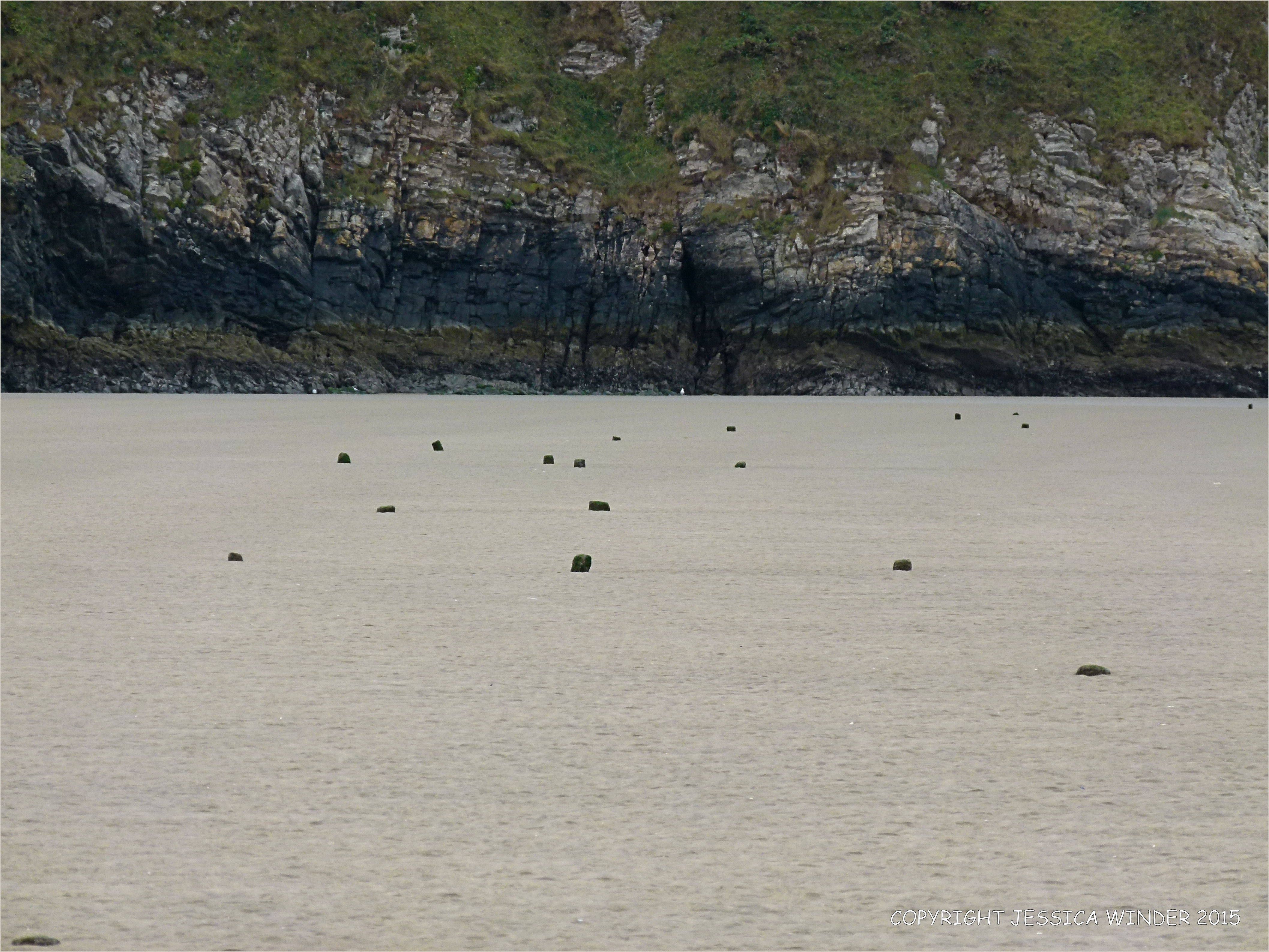 Mysterious Wooden Posts at Rhossili 2 – View looking south towards Rhossili cliffs with stumps of wooden posts belonging to an unidentified structure on Rhossili beach on the Gower Peninsula, South Wales.