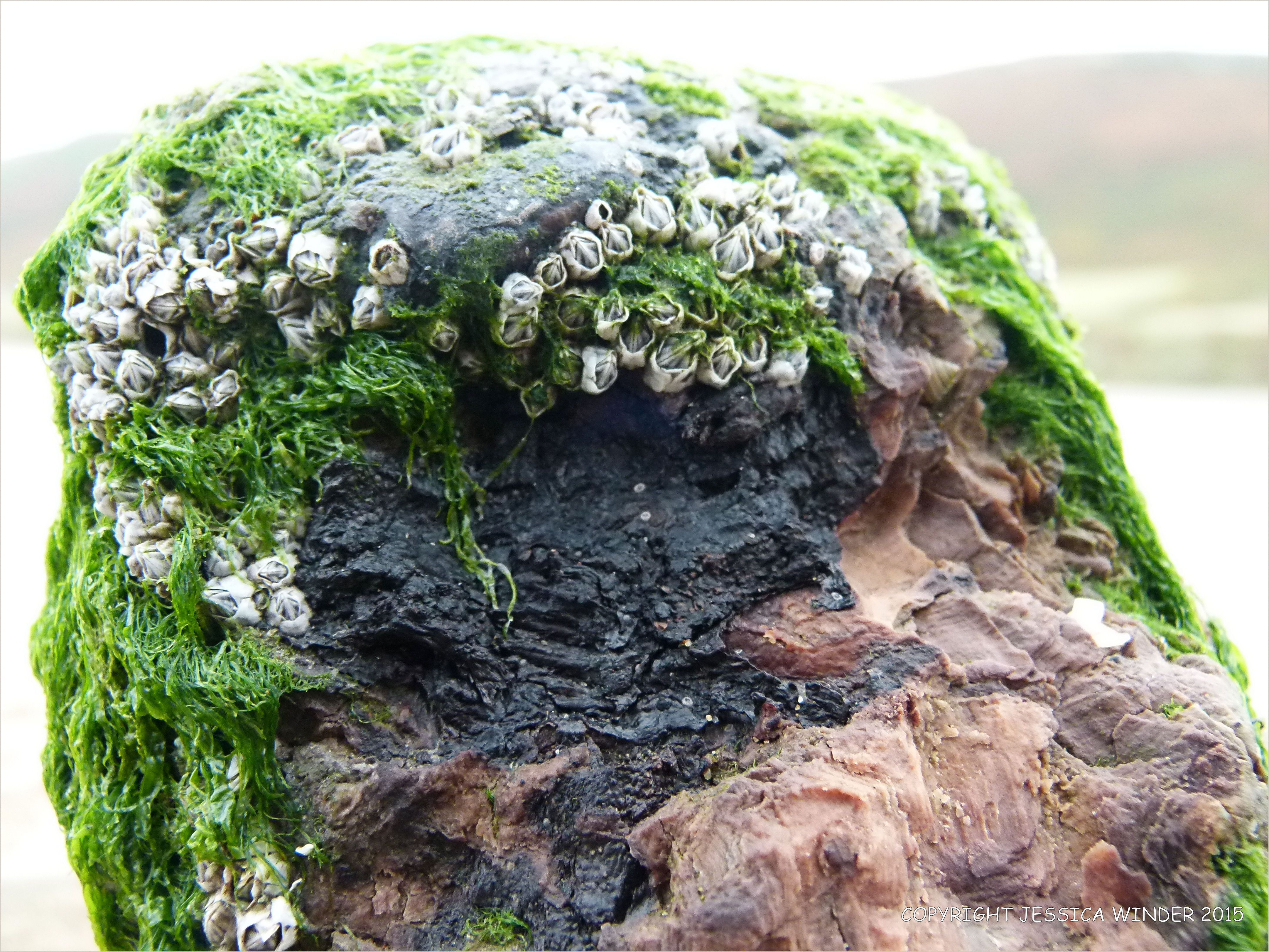 Mysterious Wooden Posts at Rhossili 4 – Stump of a wooden post, with embedded iron thought to be shrapnel, belonging to an unidentified structure on Rhossili beach, Gower, South Wales.