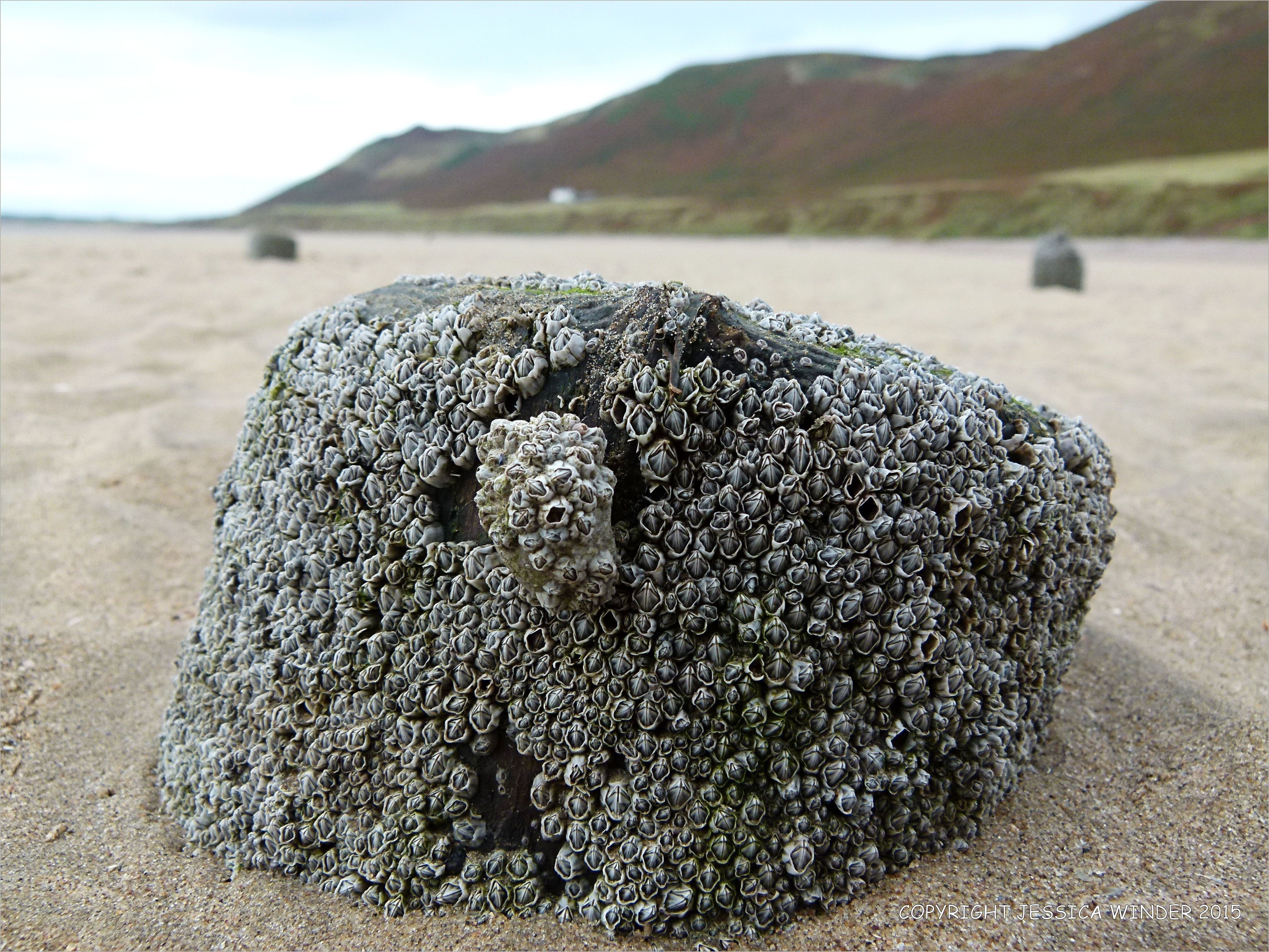Mysterious Wooden Posts at Rhossili 18 – Stumps of wooden posts belonging to an unidentified structure on Rhossili beach, Gower, South Wales, with Rhossili Down in the background.