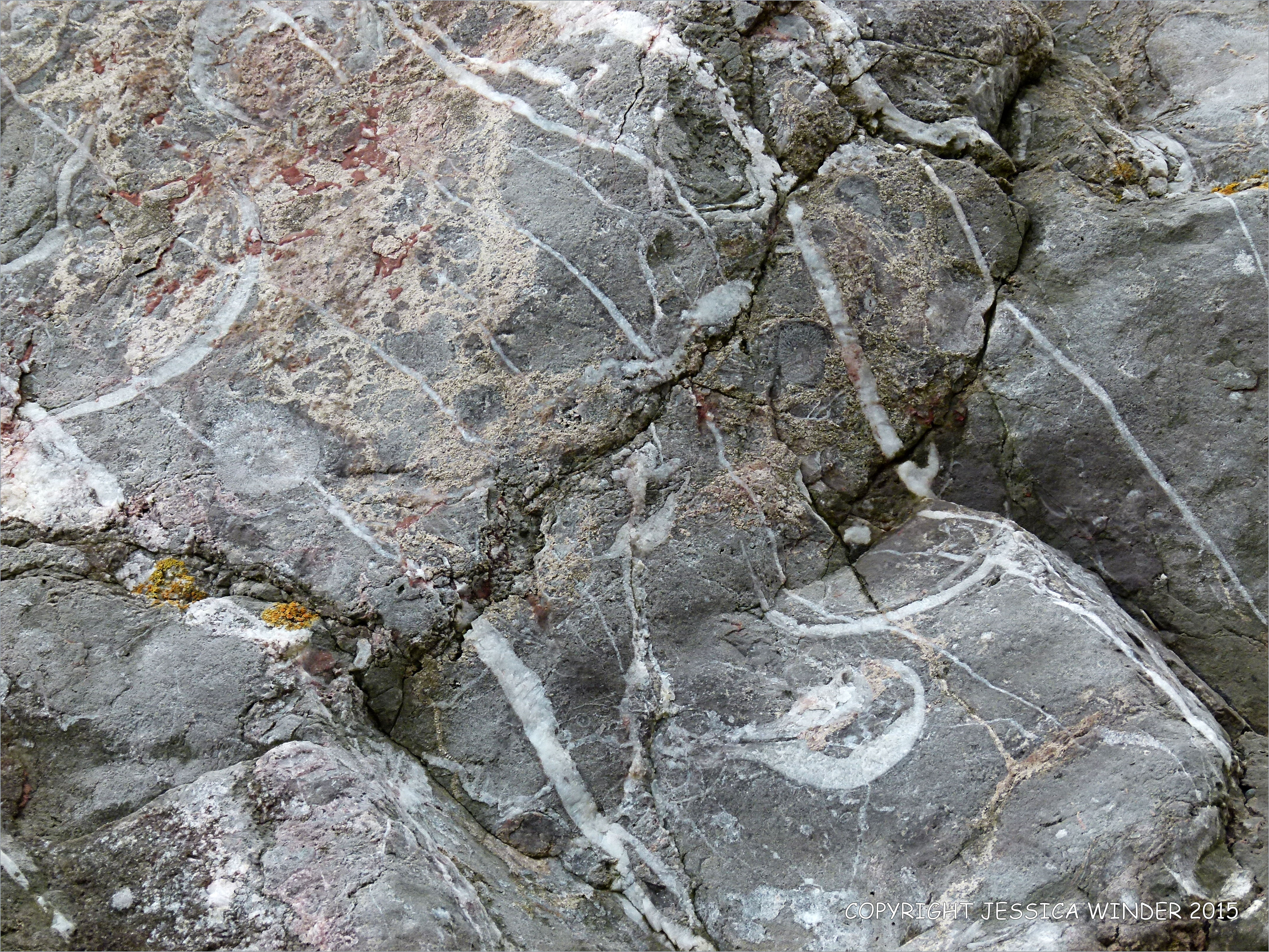 Pwll Du Rock Texture & Pattern 2 – Detail of Carboniferous Limestone at the west end of Pwll Du Bay on the Gower peninsula in South Wales, showing calcite veins and brachiopod fossils.