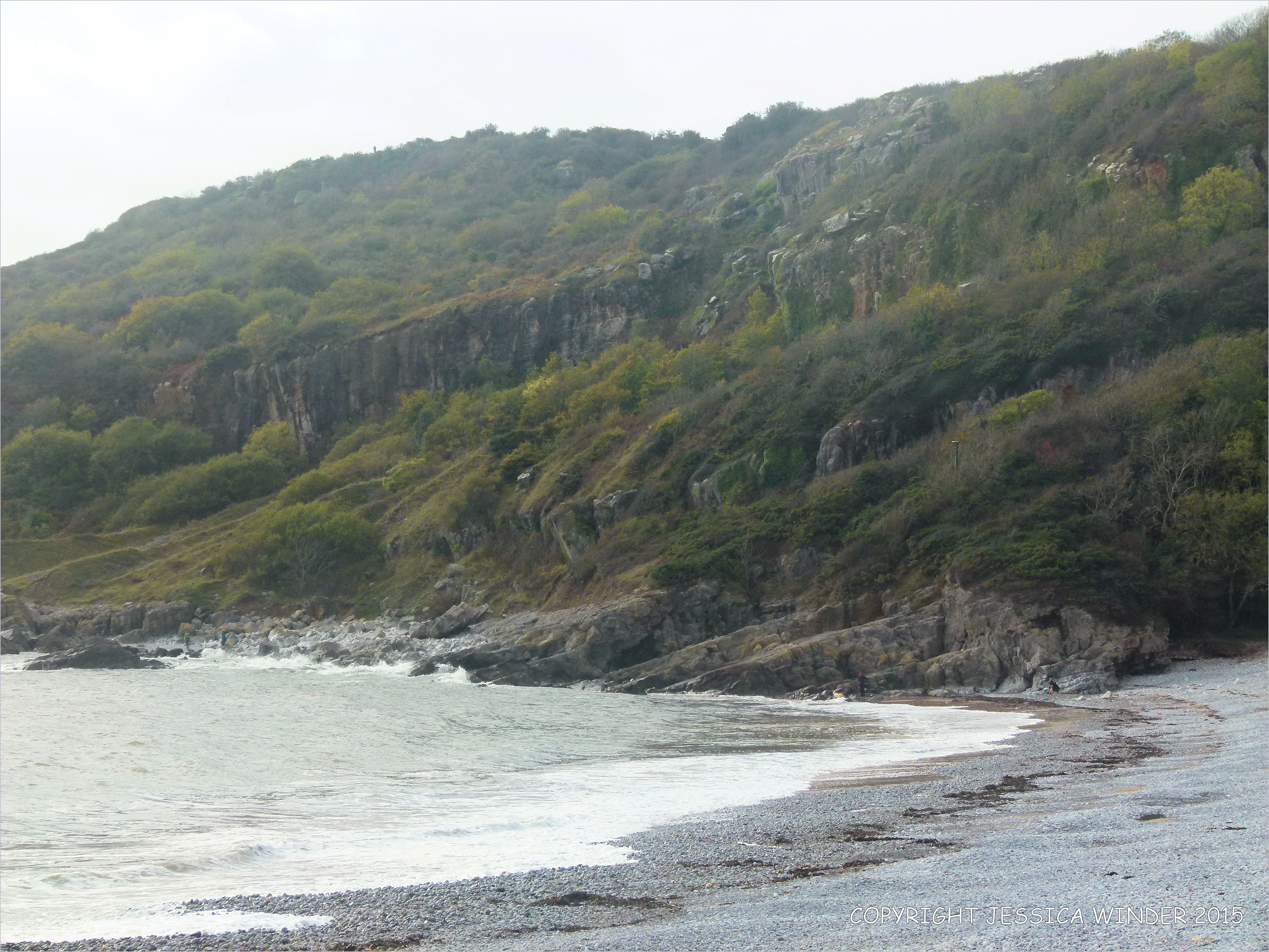 Pwll Du Rock Texture & Pattern 15 – View looking west at Pwll Du Bay towards the Carboniferous Limestone of Pwll Du Head across the shingle beach, in Gower, South Wales.