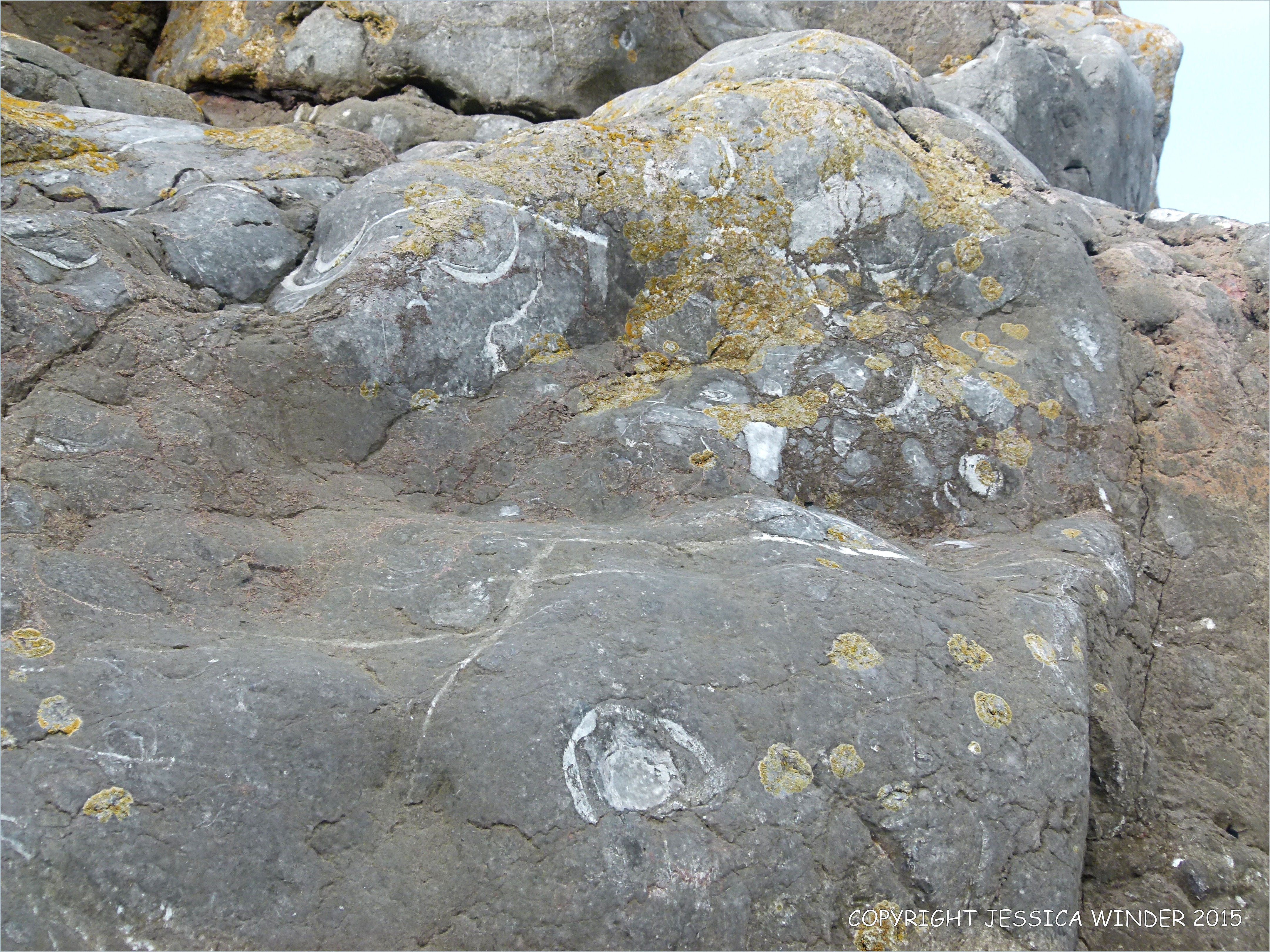 Pwll Du Rock Texture & Pattern 5 – Detail of Carboniferous Limestone at the west end of Pwll Du Bay on the Gower Peninsula in South Wales, showing calcite veins and brachiopod fossils.