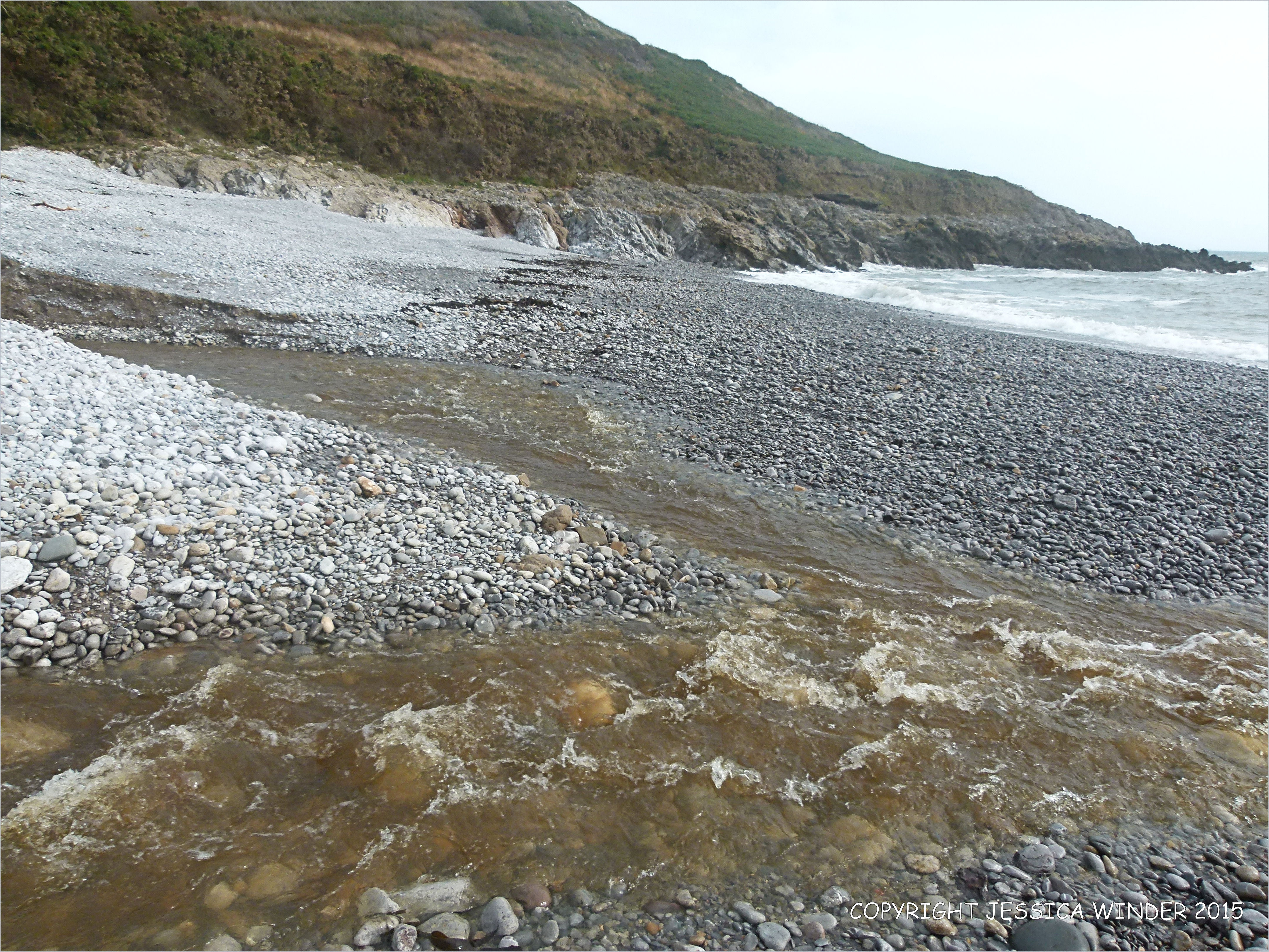 Pwll Du Shingle Banks 19 – Two streams of water flowing into the sea from the base of shingle banks that dam the Bishopston Pill river at Pwll Du Bay in Gower, South Wales.