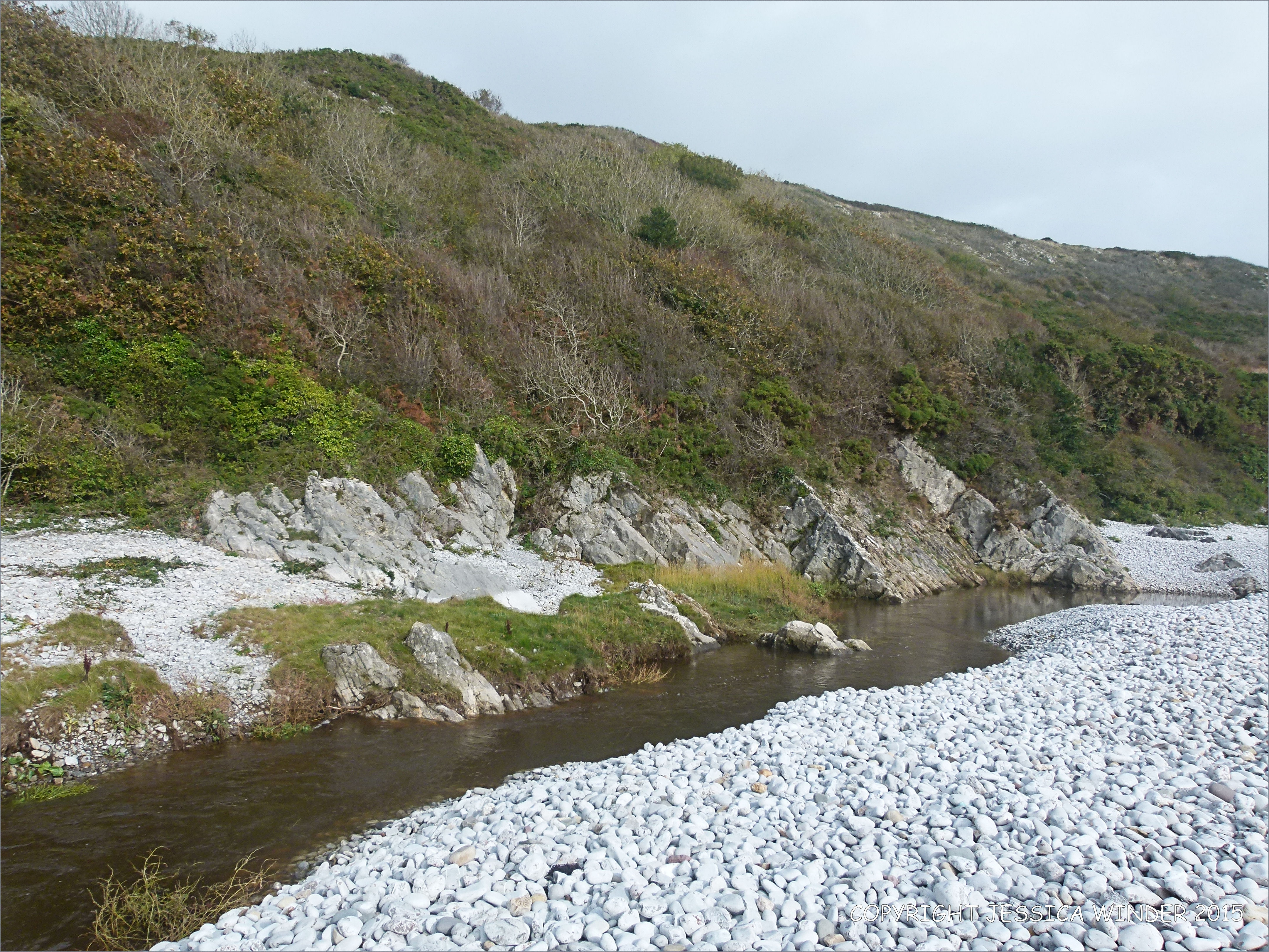 Pwll Du Shingle Banks 30 – The water of the Bishopston Pill watercourse dammed up behind the shingle banks at Pwll Du on the Gower Peninsula in South Wales.