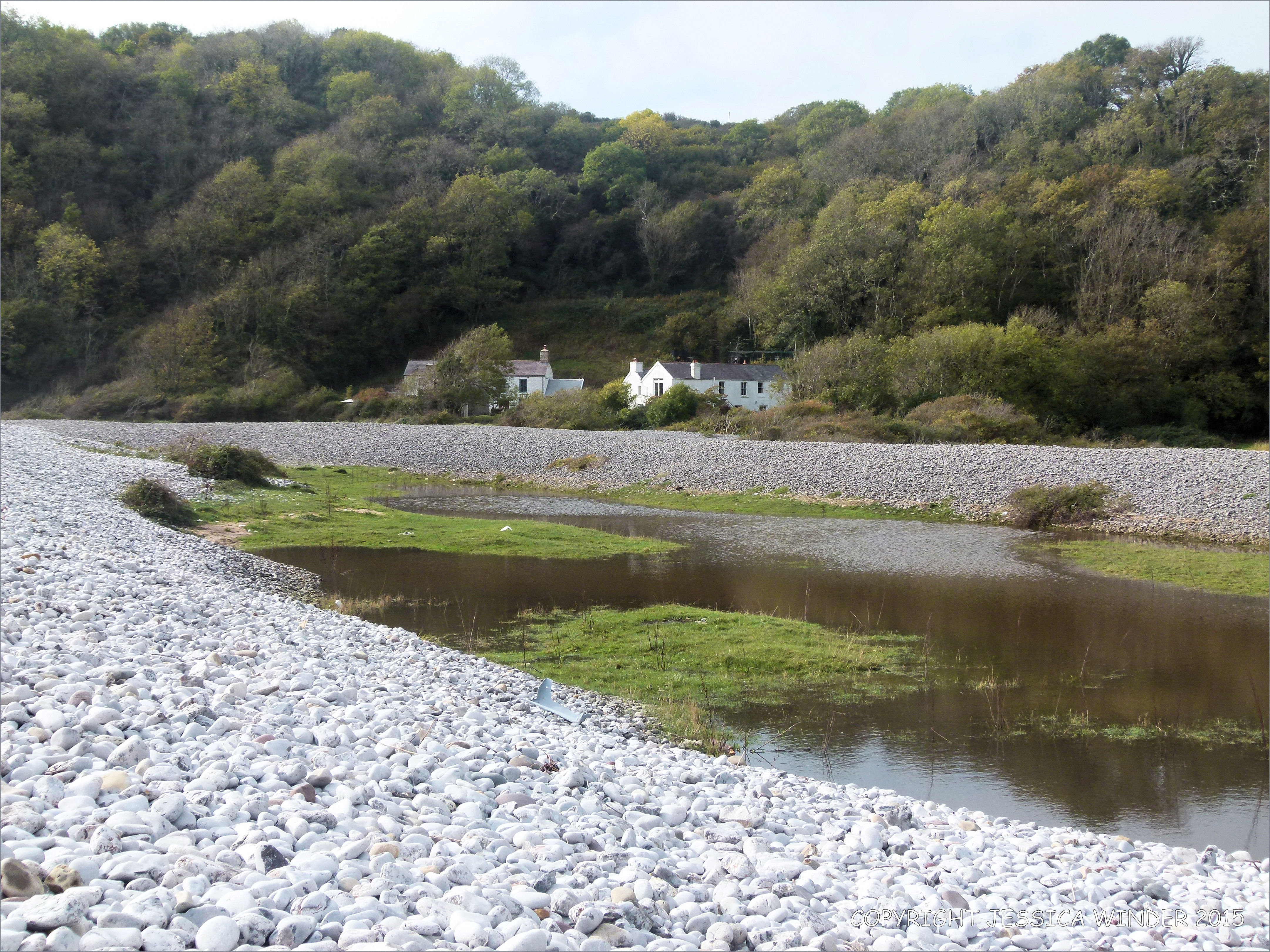 Pwll Du Shingle Banks 34 – The water of the Bishopston Pill watercourse dammed up behind the shingle banks at Pwll Du on the Gower Peninsula in South Wales. The two white buildings were once pubs catering for the many quarrymen extracting limestone from the valley sides and the headland.