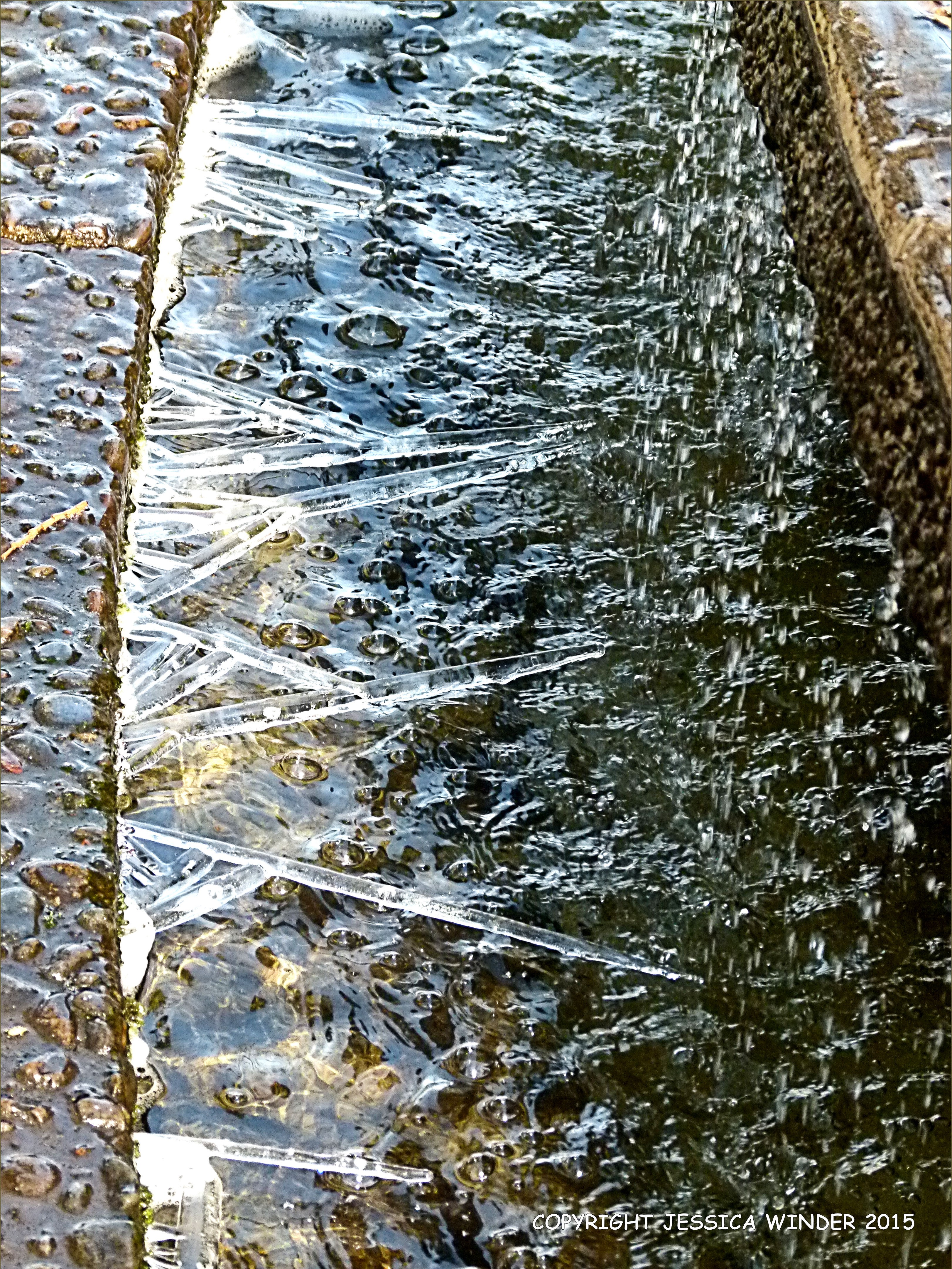 Fountain Ice Crystals 4 – Large ice crystals growing in triangular formations with extensions around the edge of a fountain in Eugene, Oregon, USA.