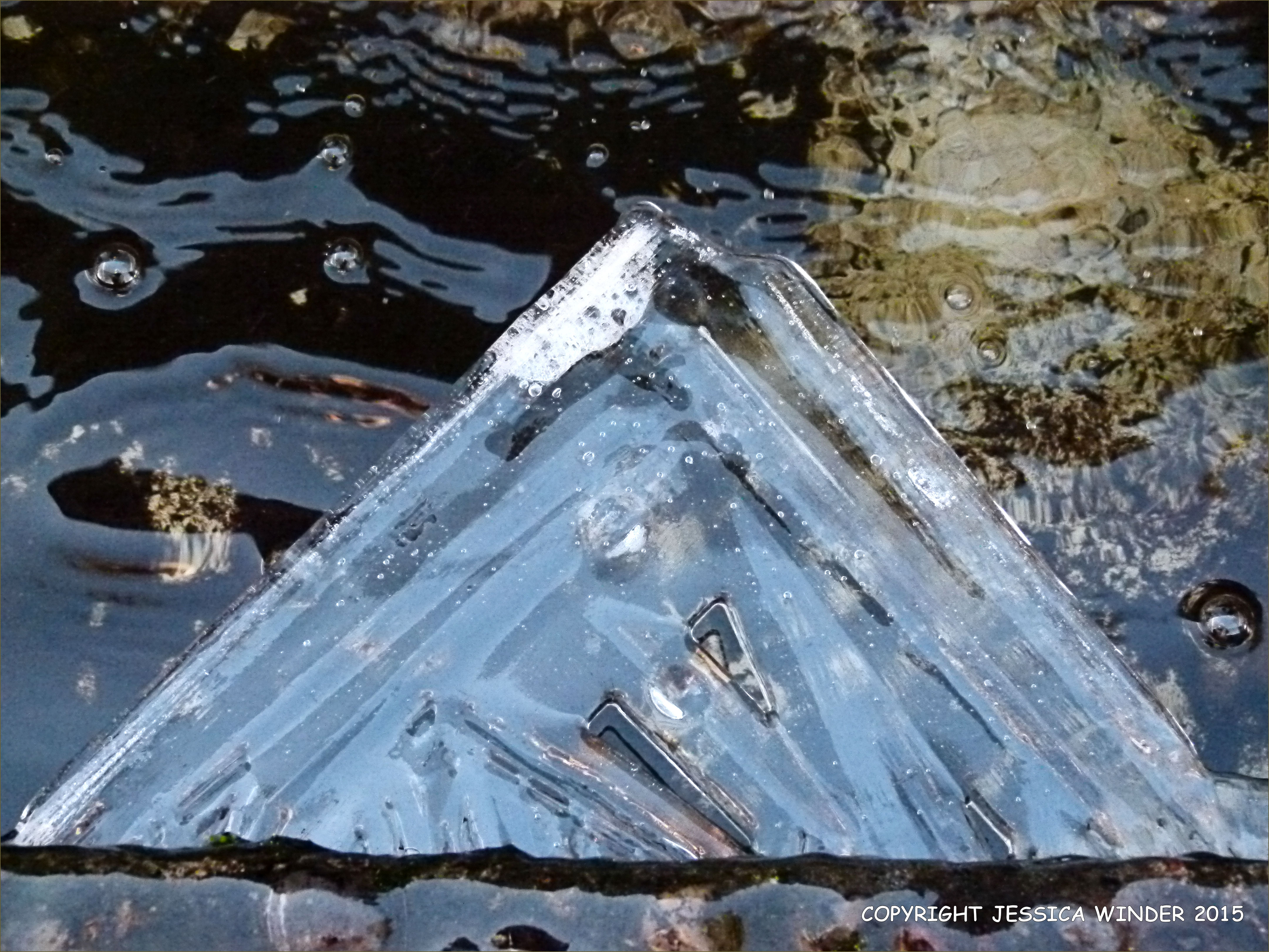 Fountain Ice Crystals 5 – Large ice crystals growing in a triangular formation around the edge of a fountain in Eugene, Oregon, USA.