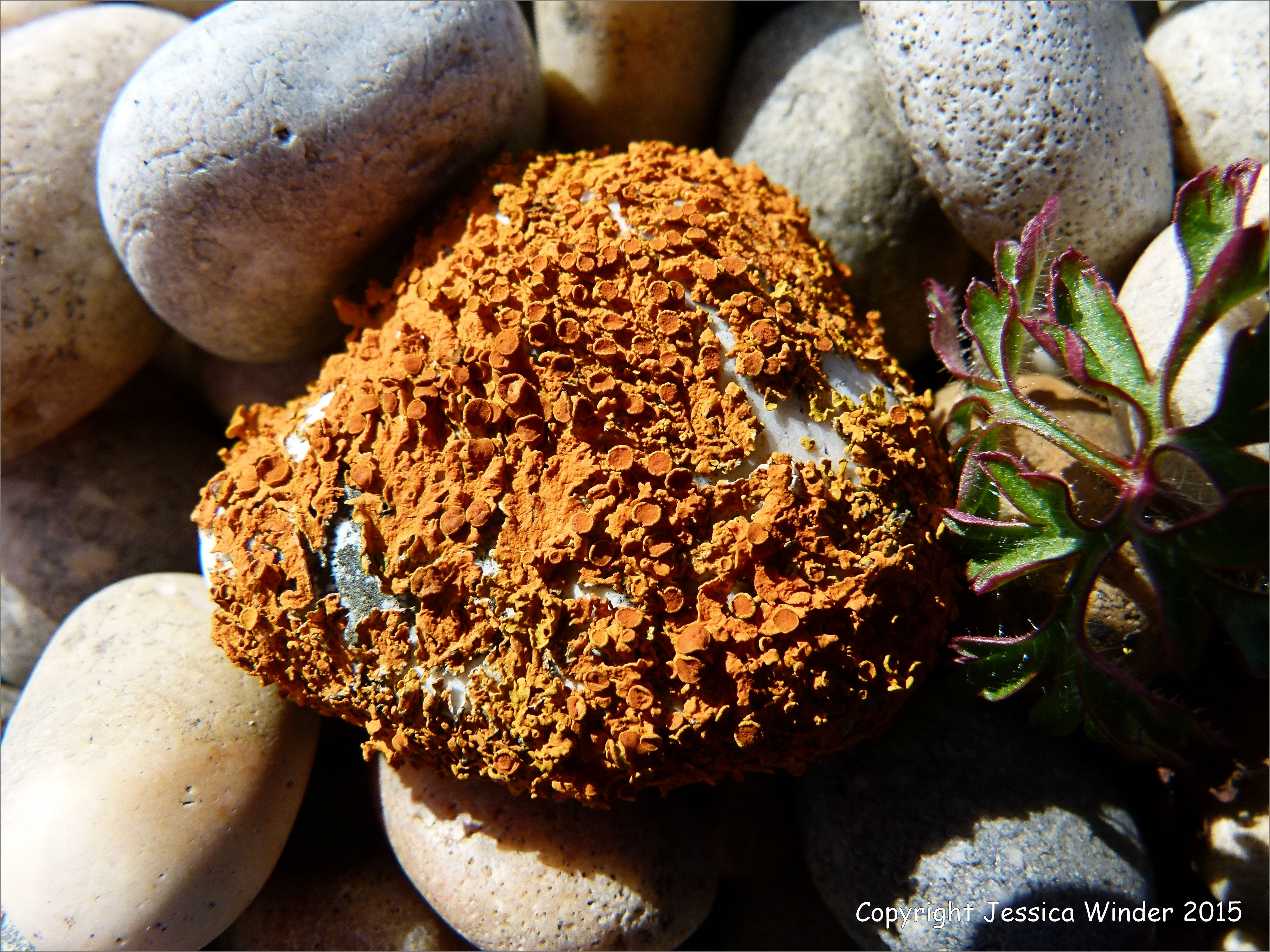 Pebbles With Lichen At Chesil 6 – Bright orange lichen growing on beach pebbles in a sheltered zone of the Chesil Bank in Dorset in the spring of 2011.
