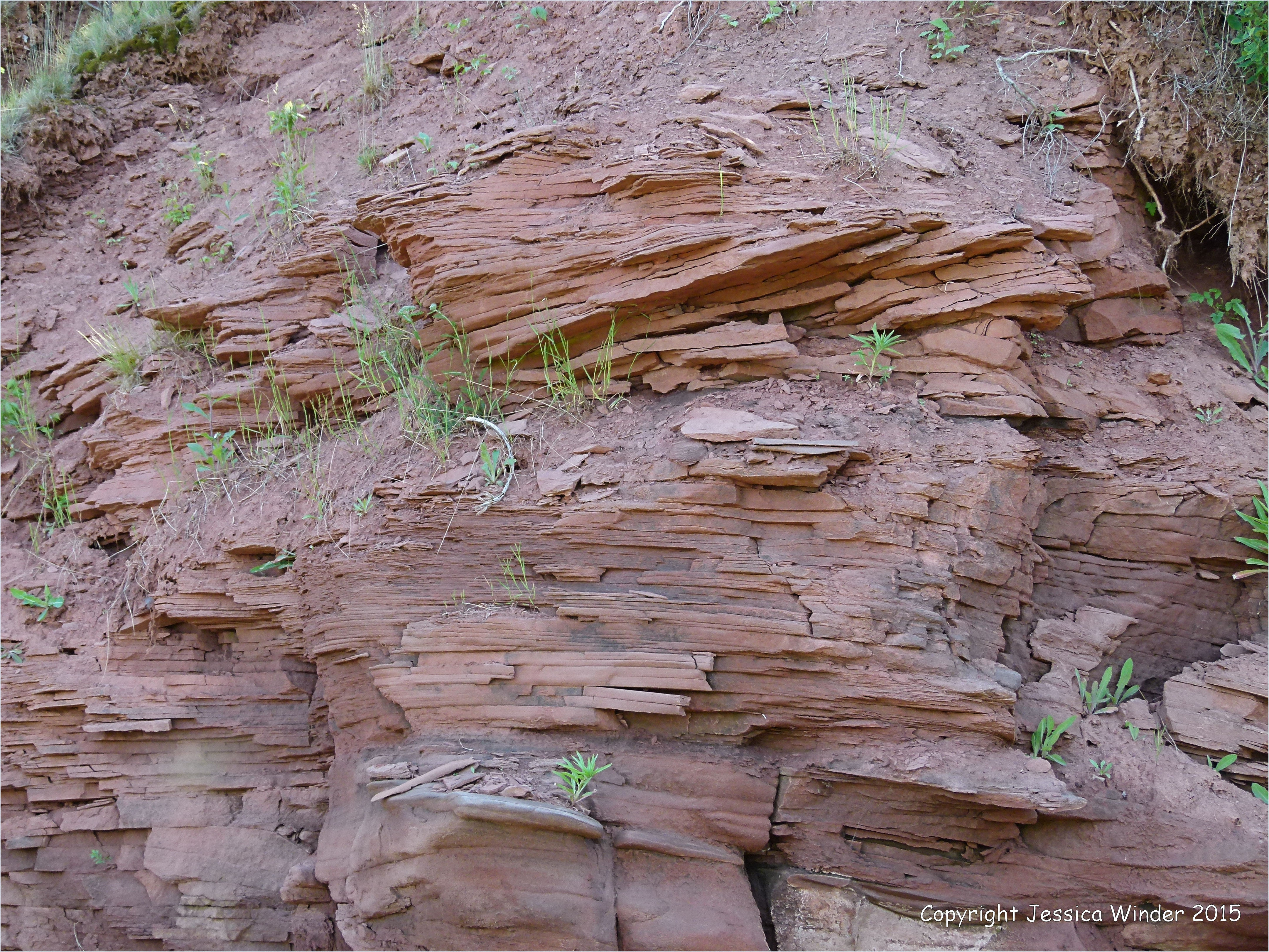 Lord Selkirk Park 5 – Layers of red Permian rock in a low cliff at Lord Selkirk Provincial Park on Prince Edward Island, Atlantic Canada.