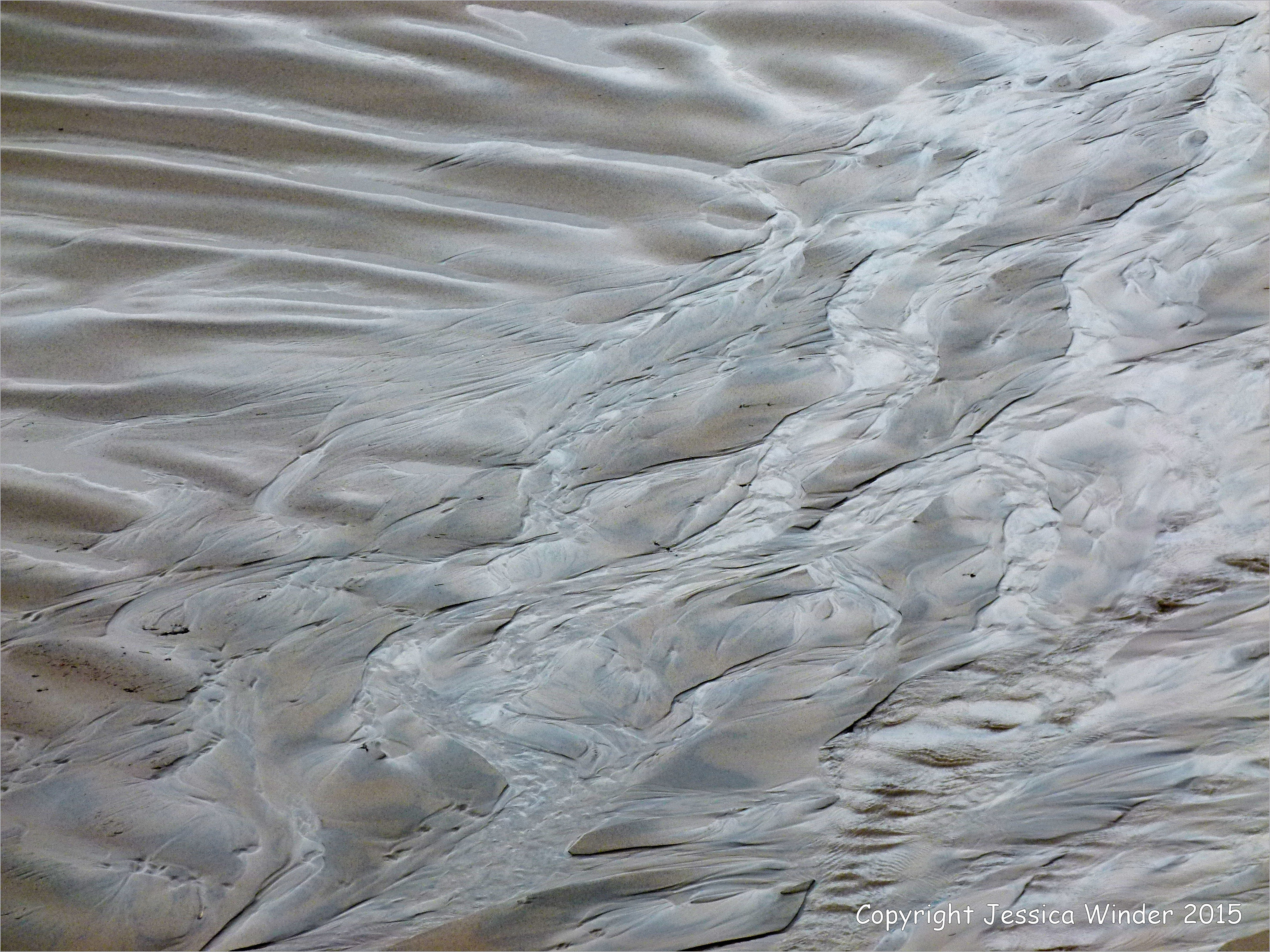 Rhossili Sand Patterns 13 (March 2015) – Silvery sand patterns at Rhossili Bay in Gower, South Wales, where low light after rain reflects on ridges and ripples where a stream crosses the sandy beach.