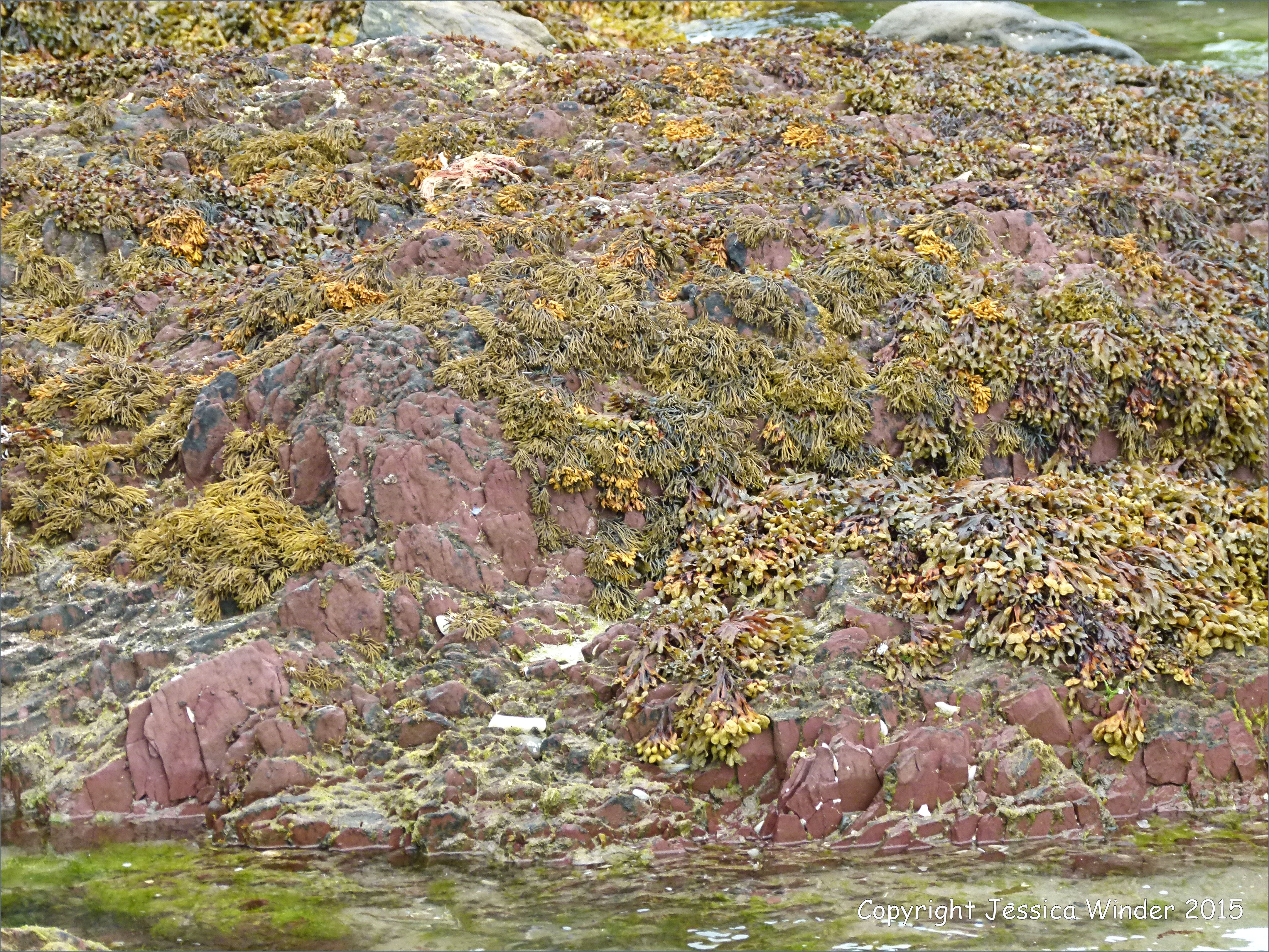 Fermoyle Rocks 17 – Yellow and green seaweed on red rocks of the Glengarriff Harbour Group from the Devonian period at Fermoyle on the north coast of the Dingle Peninsula on the west coast of Ireland.