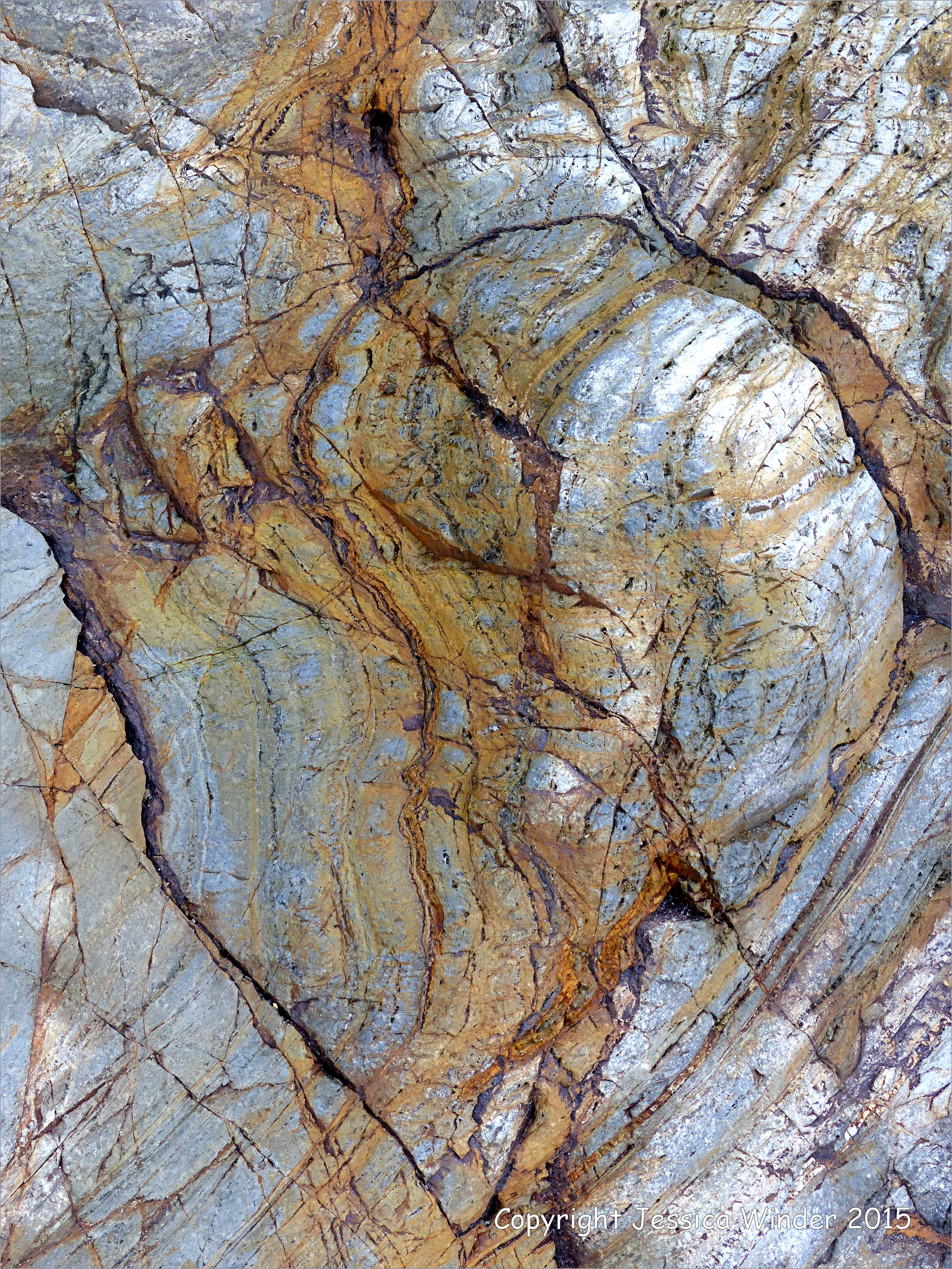 Porth Kidney Rocks 2 – Detail of the natural pattern, colour, and texture in rock from the Devonian Period Mylor Slate Formation in the cliffs at Porth Kidney sands in Cornwall, England.
