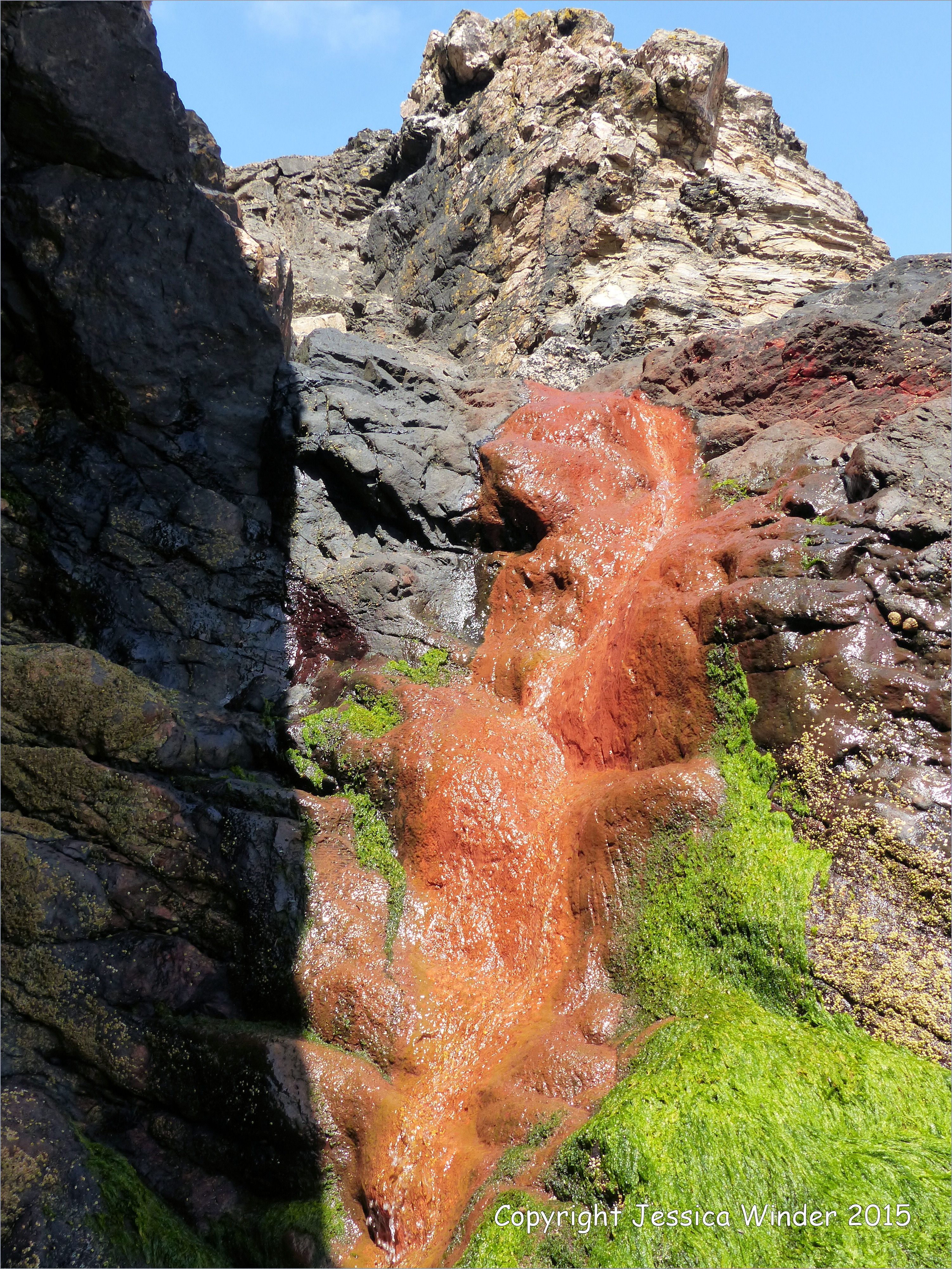 Porth Kidney Rocks 11 – Bright orange deposit from iron-bearing stream cascading down a cliff of Devonian Period Mylor Slate Formation strata at Porth Kidney Sands in Cornwall, England.