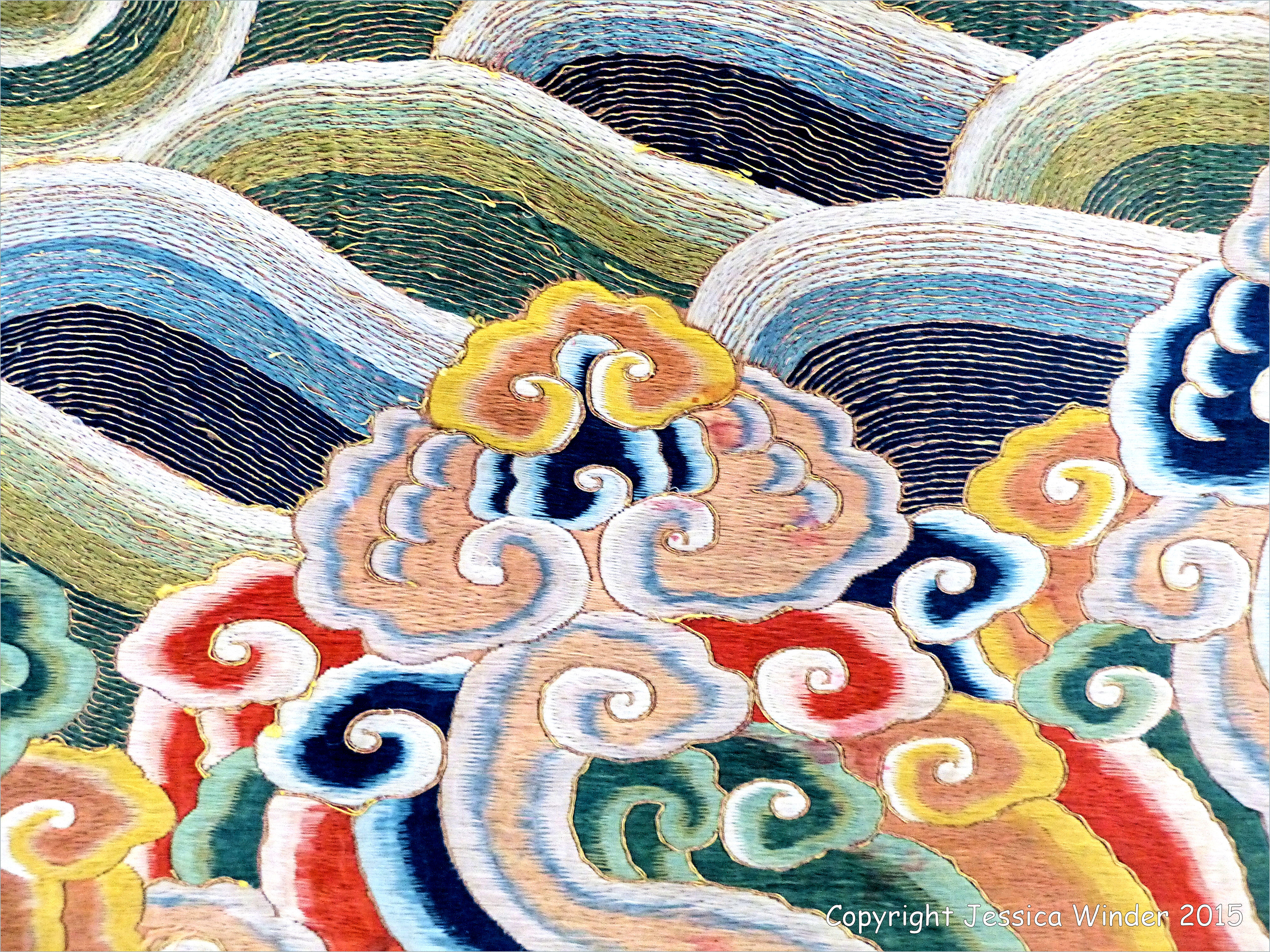 Embroidered Waves 7 – Chinese silk embroidery wave and surf design on the hem of a festive dragon robe worn by an imperial consort from the Qing Dynasty, on display at the Victoria and Albert Museum in London, England.