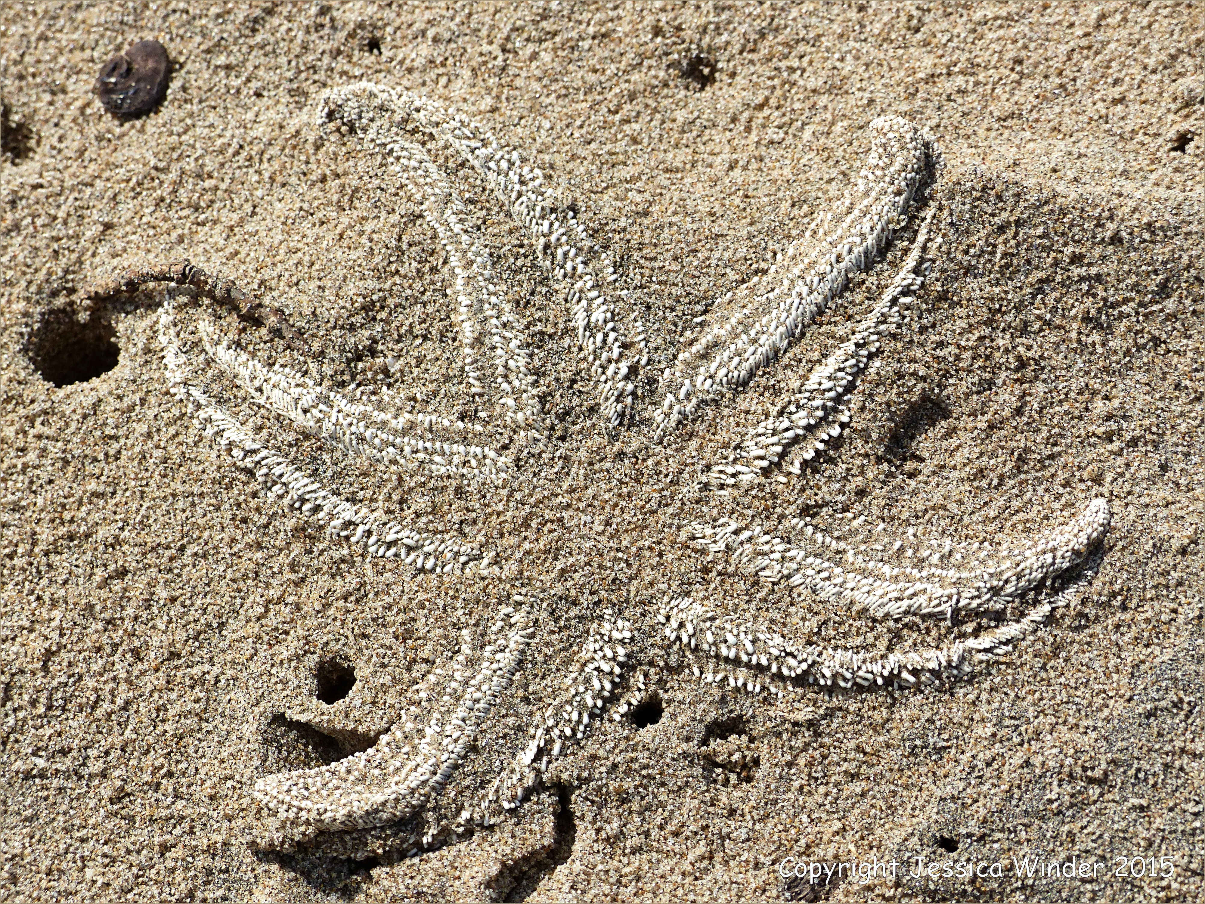 Starfish Skeletons 8 – Skeleton composed of a lattice network of small calcareous ossicles and tubercles held together by connective tissue in a dead starfish (Asterias rubens) found on the strand-line of a sandy beach at Rhossili, Gower, South Wales, April 2015.