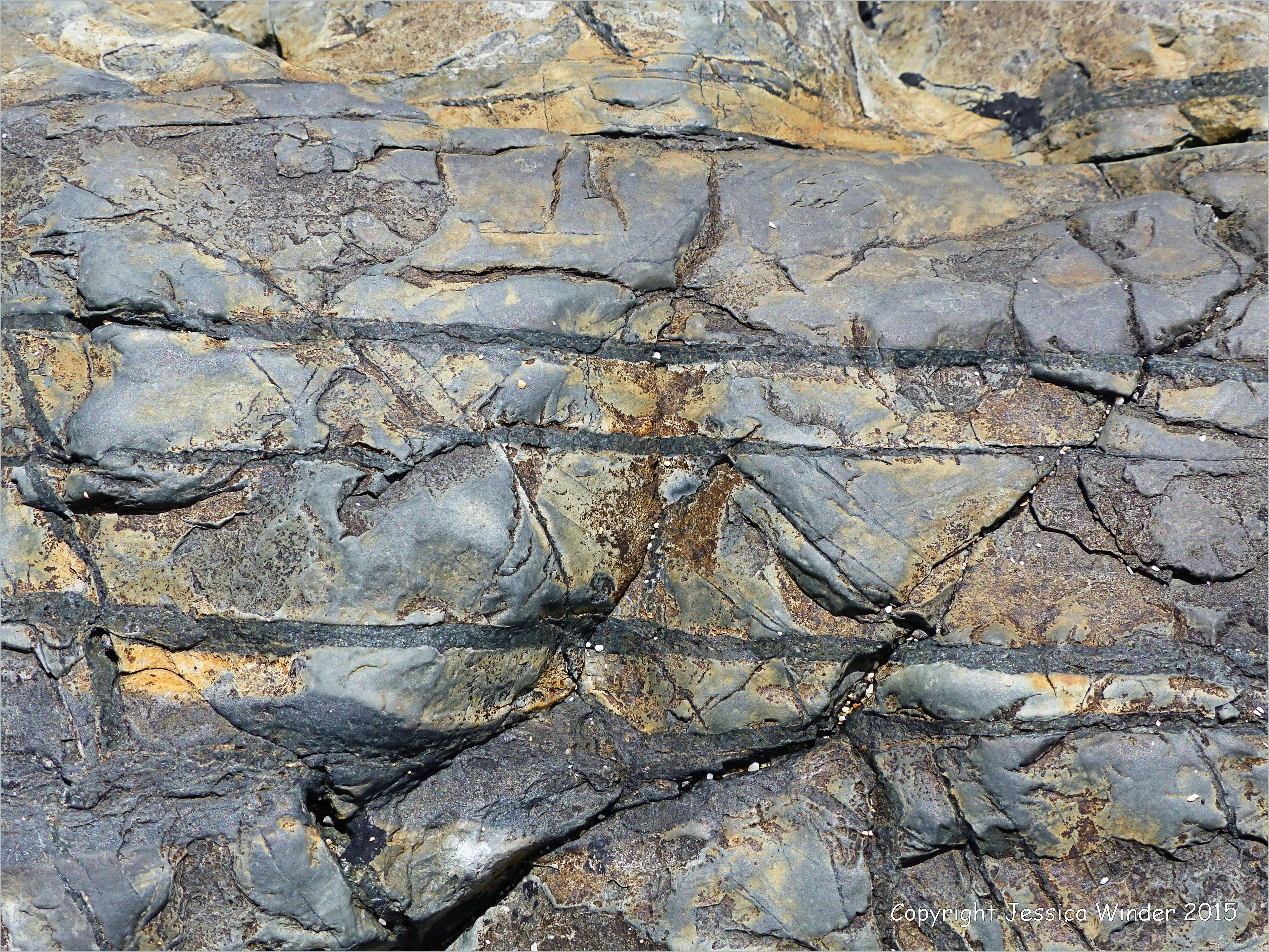 It is fascinating isn’t it? These rocks were once formed deep within the earth’s crust from molten lava pushing its way up through the crust where it settled and solidified below the surface – only to be subject at a later date to great pressures from earth movements and the heat generated by that. The original granites were completely altered by baking in the heat and by fracturing. The exact details of it all as translated into these rocks at Porthmeor are difficult to imagine,