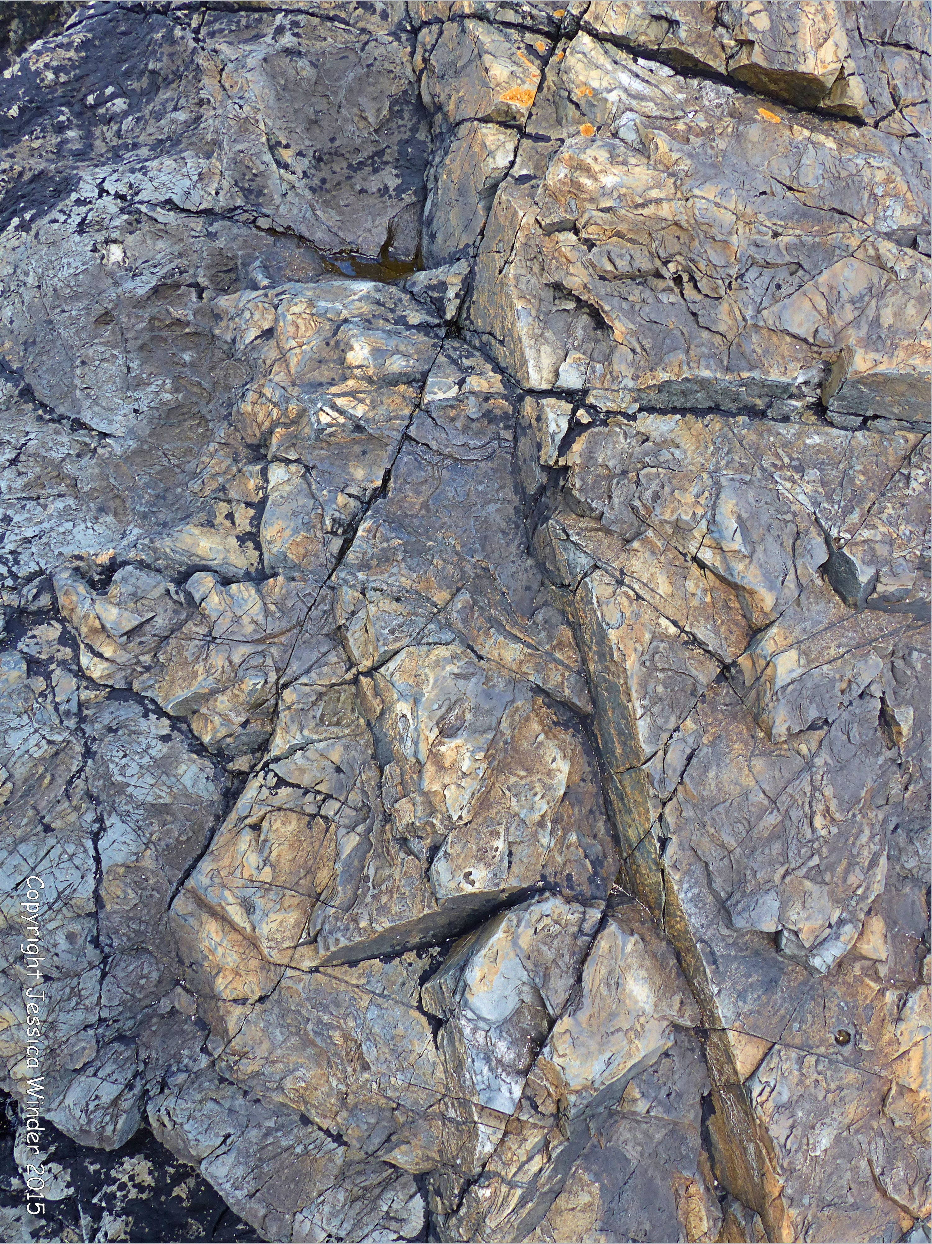 Porthmeor Rocks 37 – Natural colour, pattern, and texture in metamorphosed igneous intrusive rock dating from the Devonian Period on the west side of “The Island” (St Ives Head) on the east side of Porthmeor Beach at St Ives in Cornwall, England.