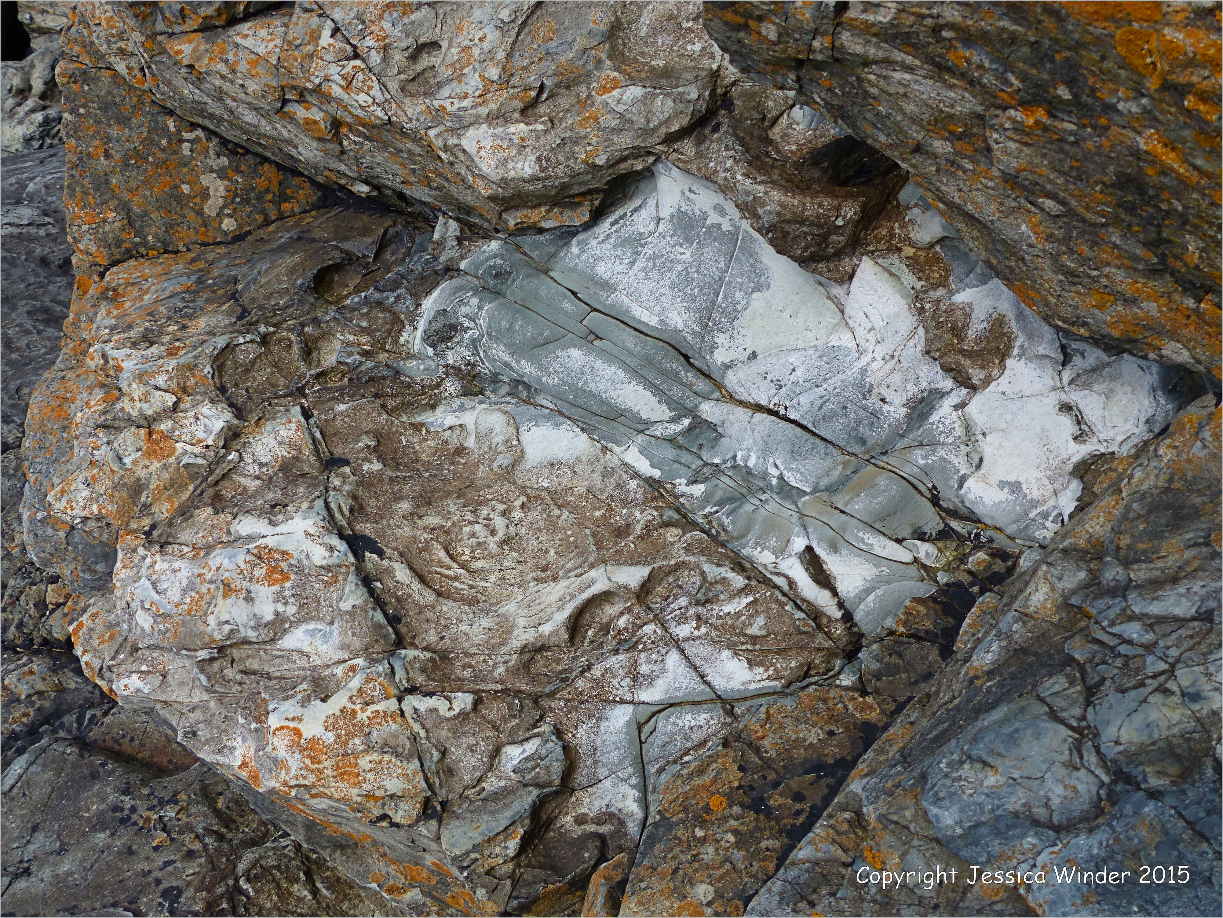 Porthmeor Rocks 38 – Natural colour, pattern, and texture in metamorphosed igneous intrusive rock dating from the Devonian Period on the west side of “The Island” (St Ives Head) on the east side of Porthmeor Beach at St Ives in Cornwall, England.