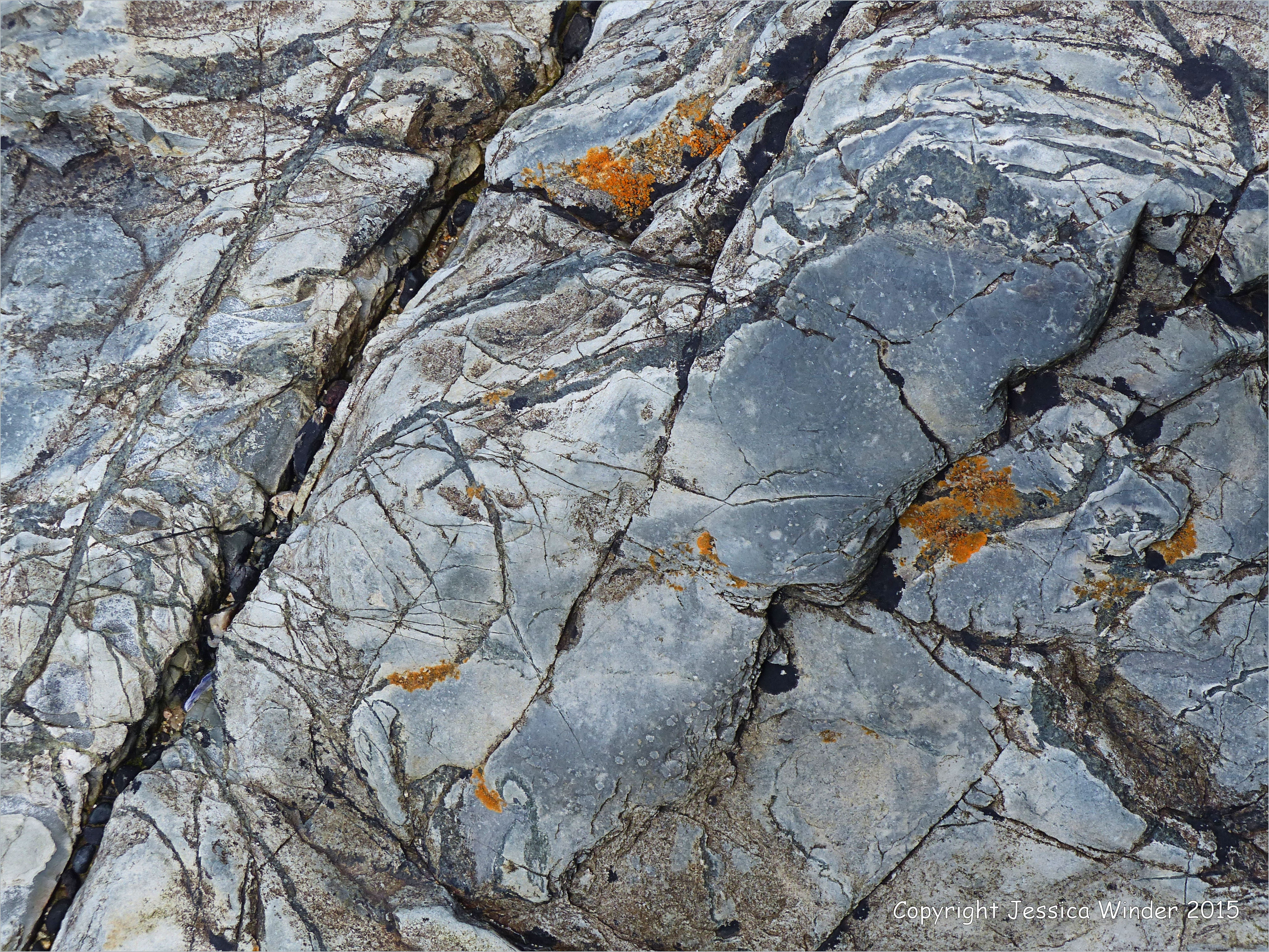 Porthmeor Rocks 39 – Natural colour, pattern, and texture in metamorphosed igneous intrusive rock dating from the Devonian Period on the west side of “The Island” (St Ives Head) on the east side of Porthmeor Beach at St Ives in Cornwall, England.