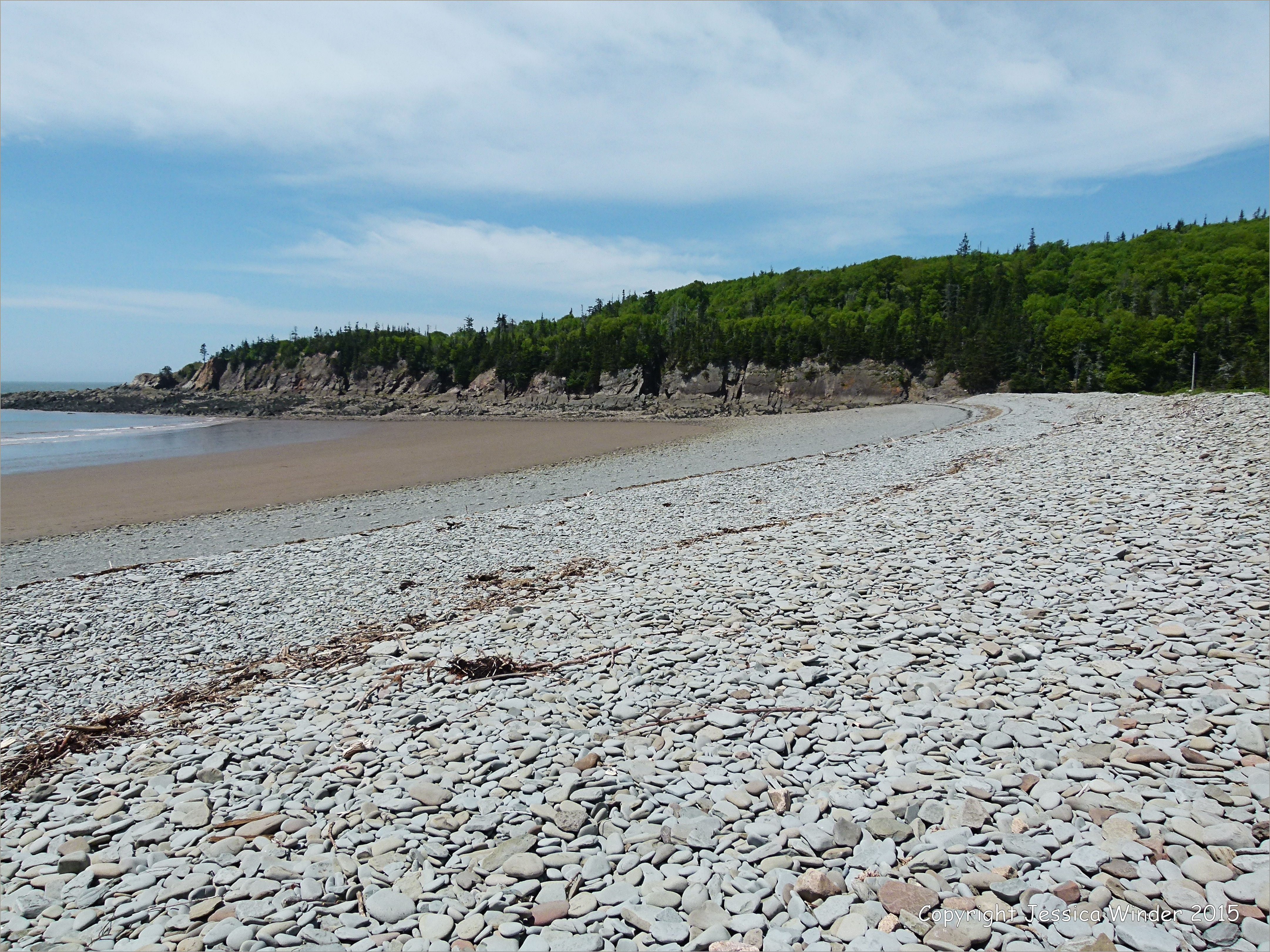 Rocks Near Cape Enrage 10 – View across a shingle bank and sandy beach towards a pine-topped rocky promontory on the north shore of the Bay of Fundy, New Brunswick, Canada.