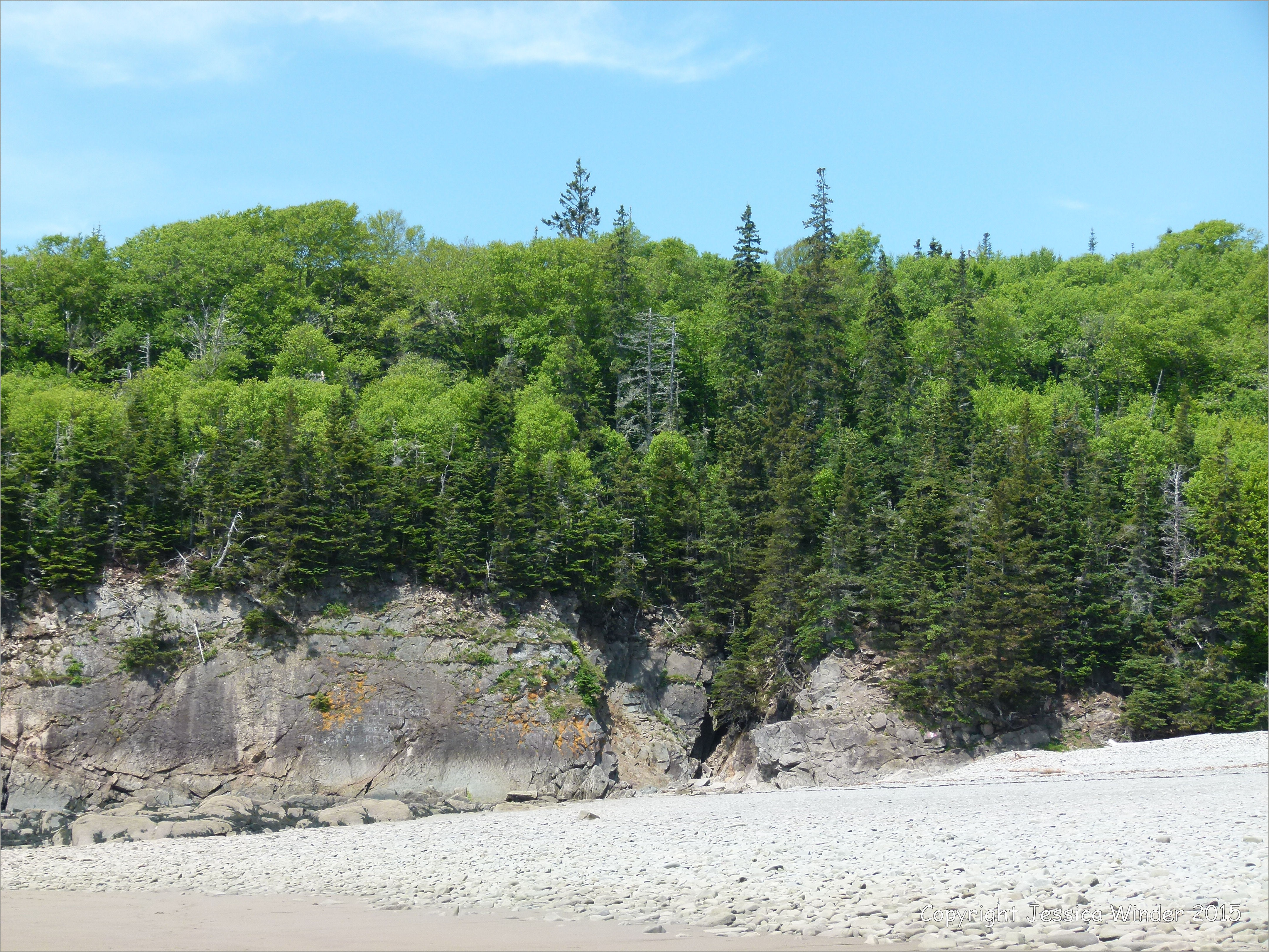 Rocks Near Cape Enrage 2 – Pine-topped cliff strata of Late Carboniferous Period Mabou Group, west of Cape Enrage in New Brunswick, Canada, on the north shore of the Bay of Fundy.