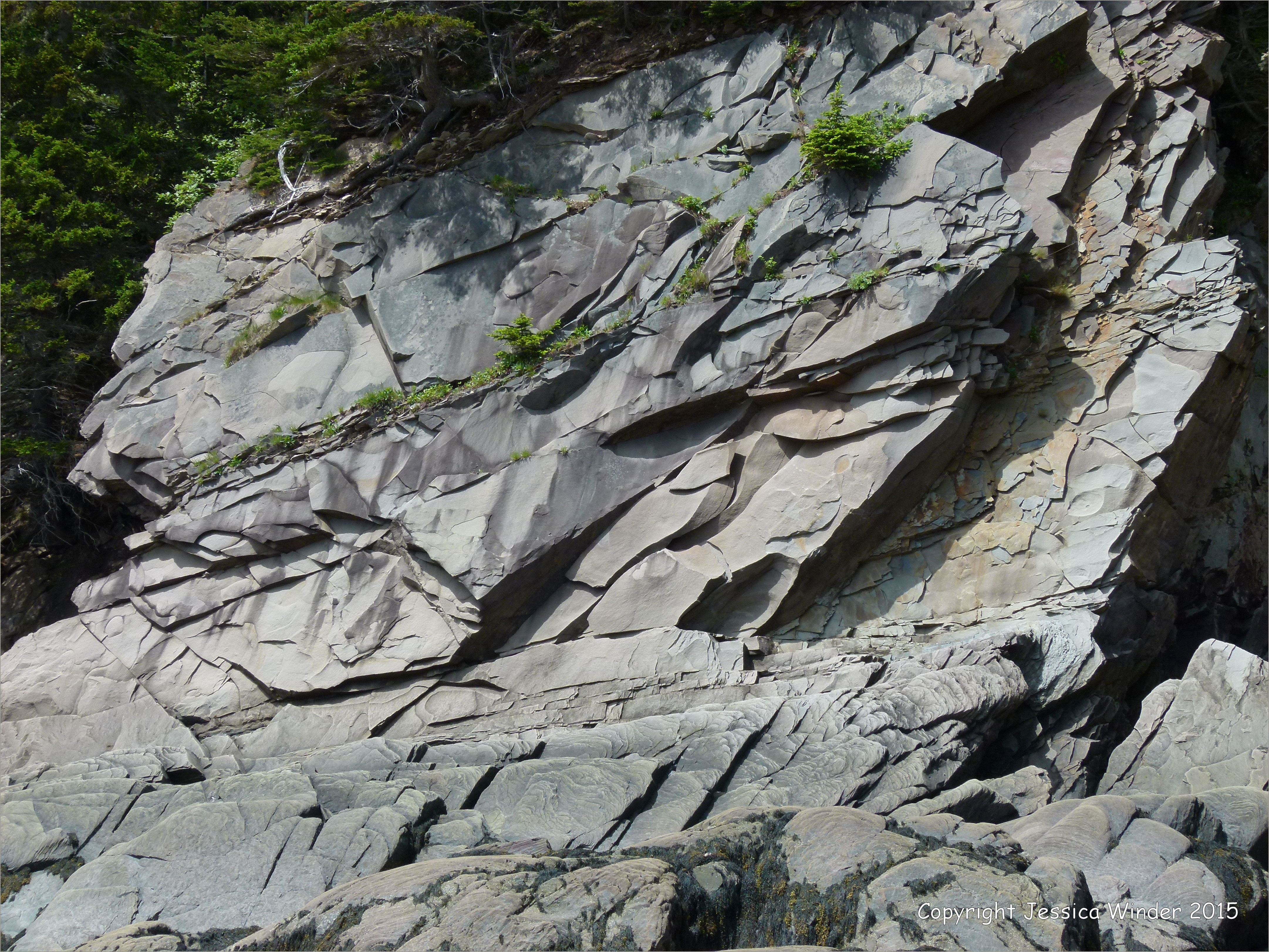 Rocks Near Cape Enrage 4 – Fractured cliff strata of Late Carboniferous Period Mabou Group, west of Cape Enrage in New Brunswick, Canada, on the north shore of the Bay of Fundy.