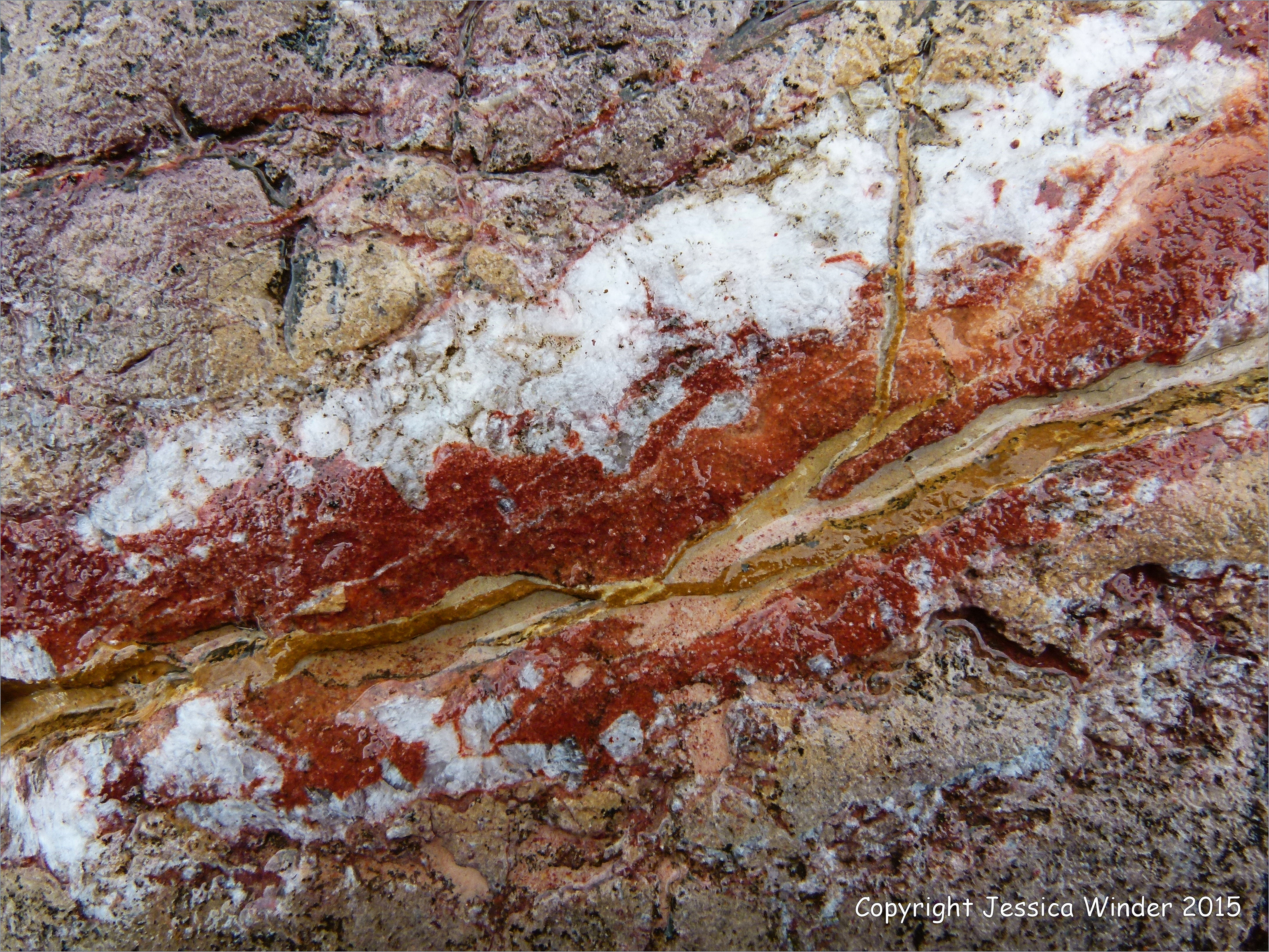 Colourful & Interesting Rocks 008 – Colourful pattern with calcite and haematite in rip-rap at Seaton in Devon, England.