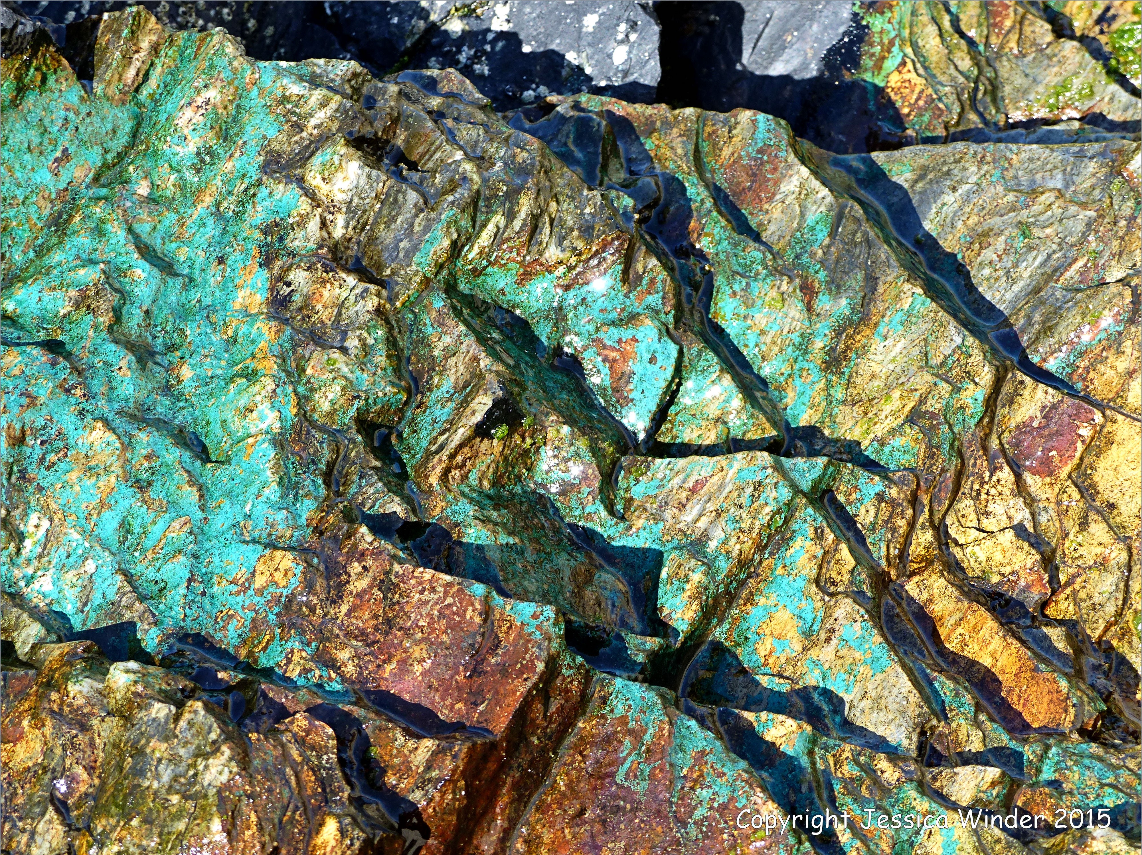 Colourful & Interesting Rocks 044 – Blue-green copper minerals in cliff rocks at Porth Kidney in Cornwall, England